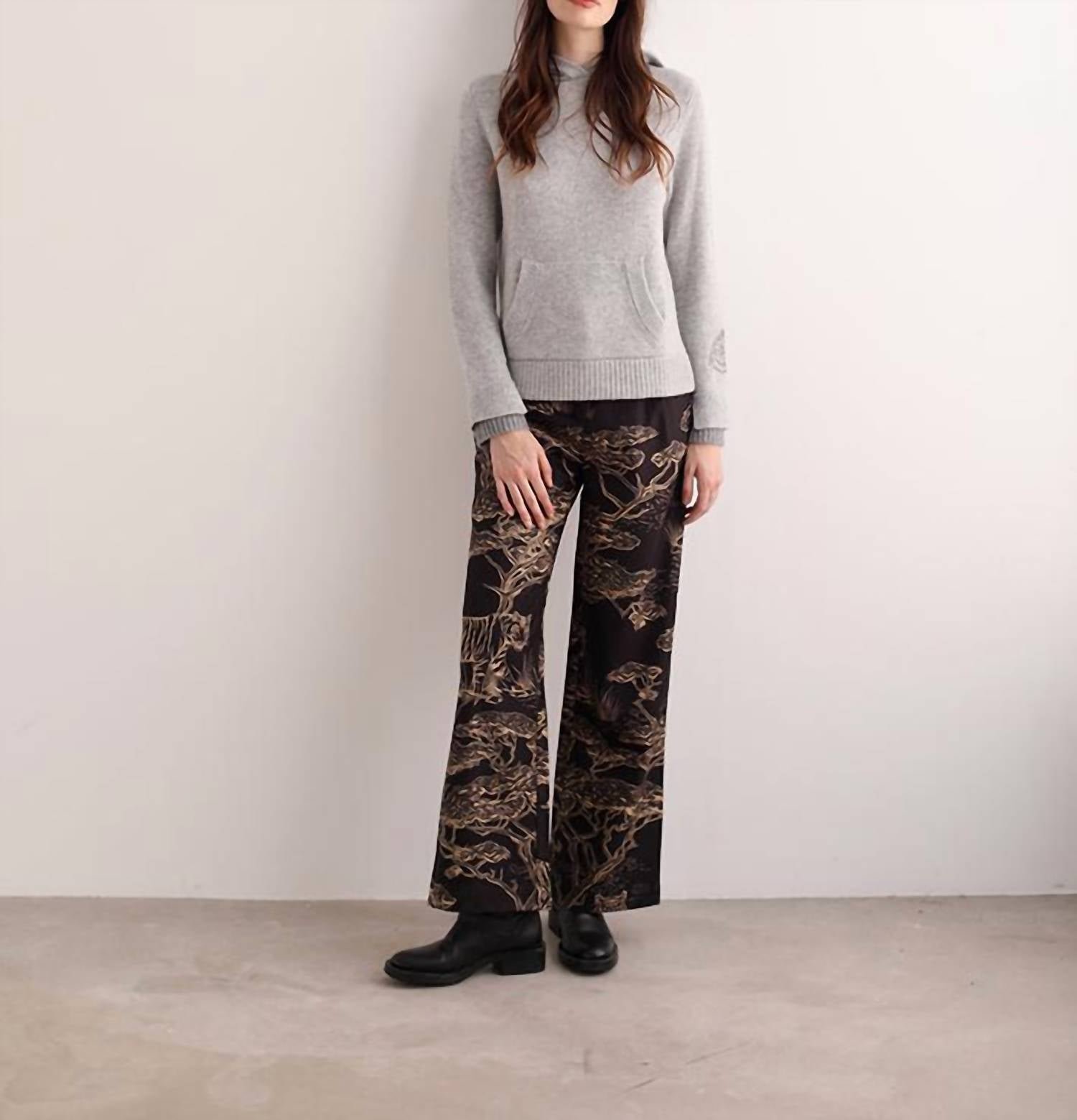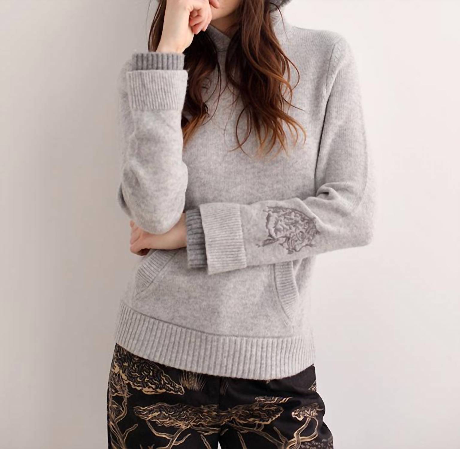 Whether you're running around town or lounging at home, this sweatshirt works for both. Discover cozy sophistication with the Cheetah Embroidered Hoodie by Las Sureñas Arg, a minimalist piece perfect for winter vacations. Featuring long sleeves and made from a luxurious blend of 70% wool and 30% cashmere, it ensures warmth and comfort. The hoodie is designed with front pockets and a unique cheetah embroidery on one wrist, adding a touch of playful elegance. Enjoy the ease of a pull-on closure, and embrace its textured pattern and hooded neckline in a versatile grey color.