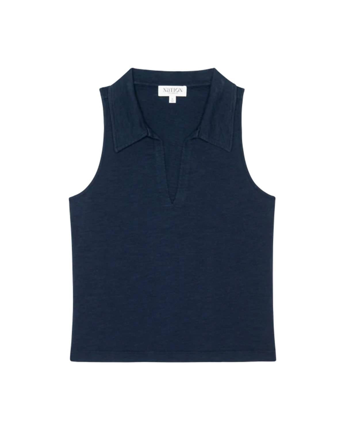 The Roberta Collared Tank by Nation LTD is a must-have piece, emphasizing style and comfort in Night Sky. This sleeveless tank features a chic collar with a bra-friendly V-neck, crafted from 100% Peruvian Cotton known for its hypoallergenic and breathable qualities. Made in Peru, it promises durability and softness, with a convenient pull-on closure. For care, machine wash and line dry are recommended to maintain its shape and quality.