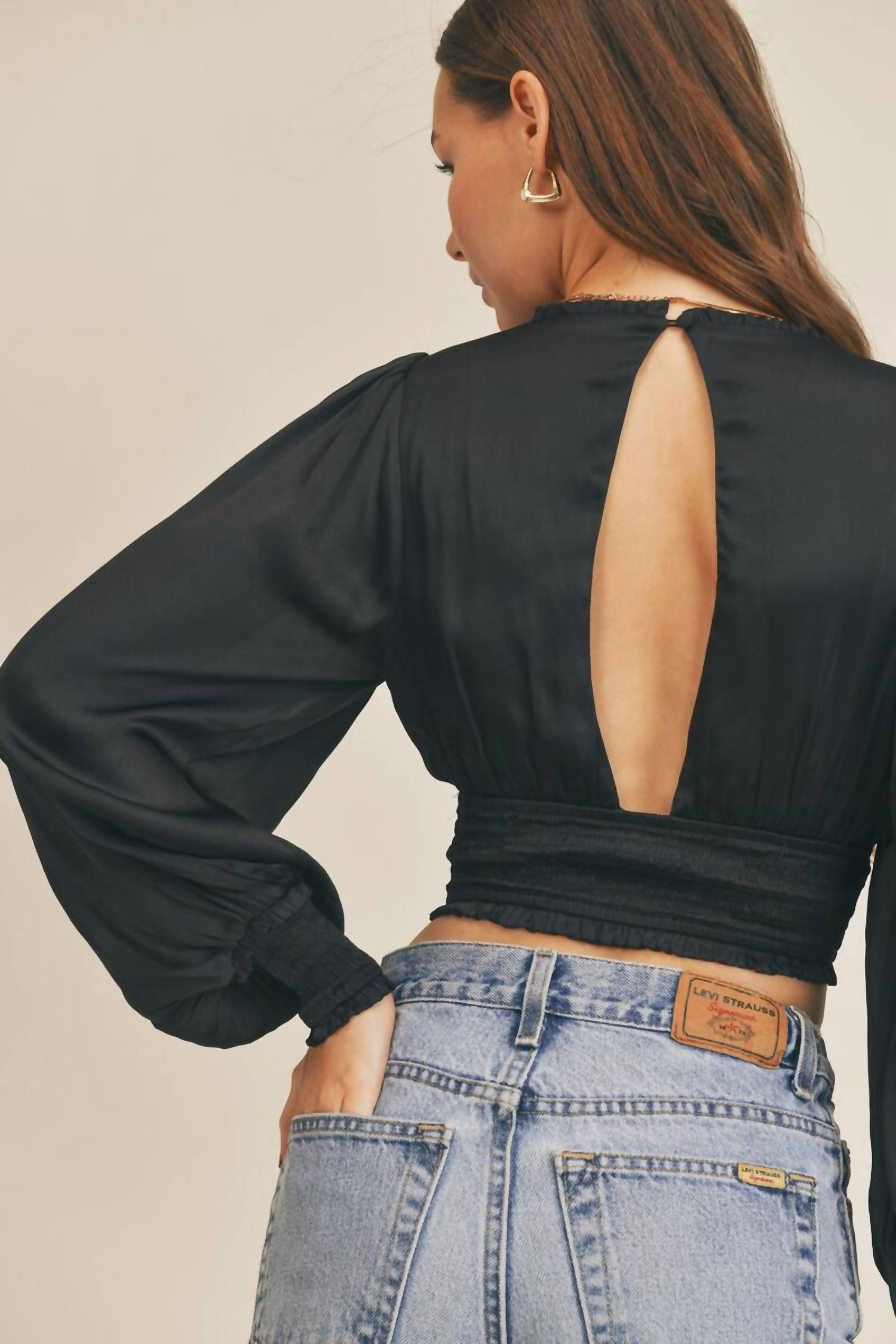 The Fallon Top in black is a chic crop top designed to blend elegance with contemporary style. Crafted from smooth 100% polyester fabric, it offers a sleek, silky texture that drapes beautifully. The sophisticated V-neckline enhances the neckline with a refined touch, while the cinched wrists add subtle volume and tailored detail to the sleeves. A flexible elastic band at the waist ensures a flattering fit and comfortable wear throughout the day or evening. Perfect for pairing with high-waisted trousers or skirts, this top effortlessly combines polished style with modern flair. Model is wearing a size small.