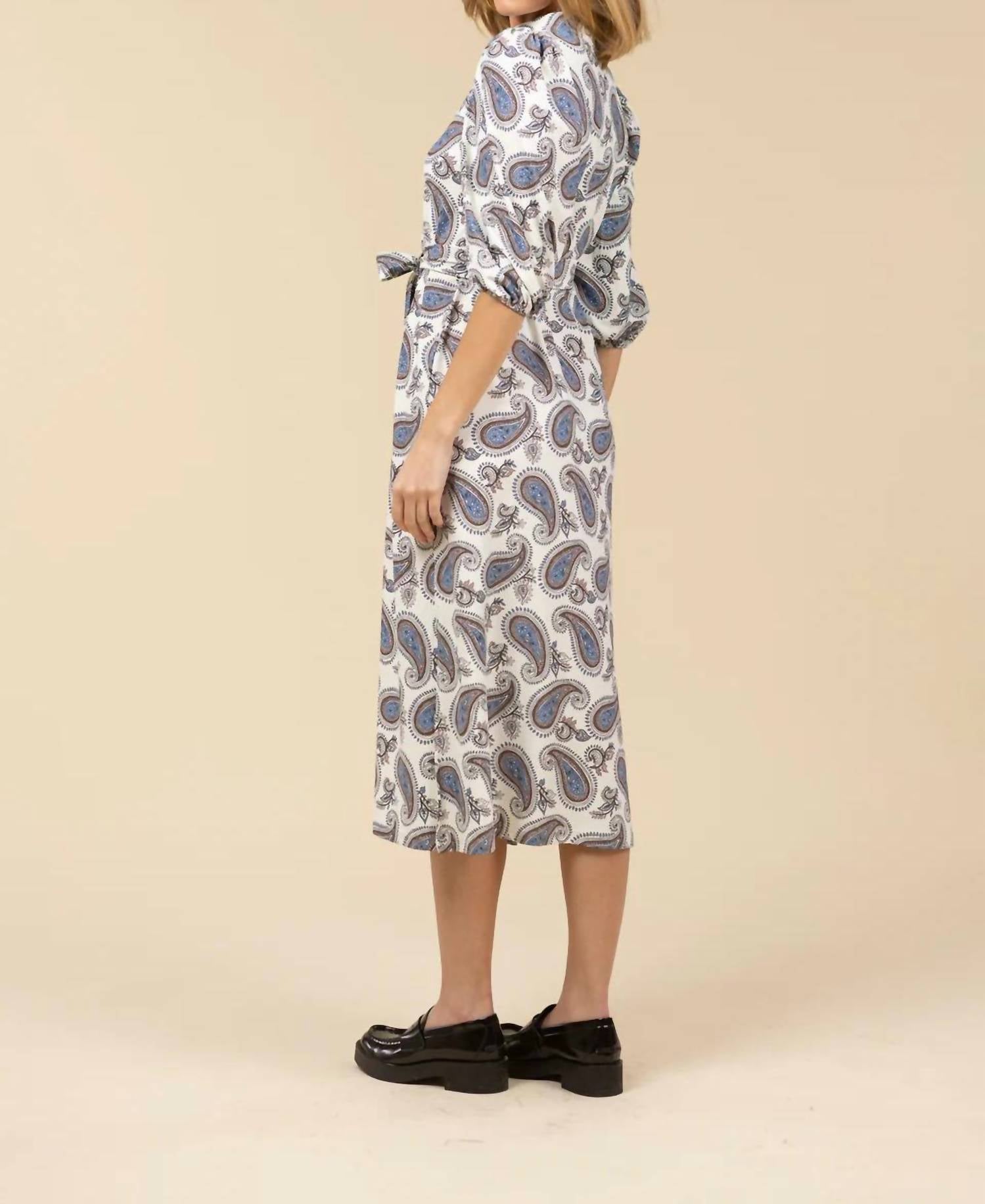 Introducing the Brooks Midi Dress by SMITH & QUINN, a stylish and sophisticated tunic dress in vibrant Grandpas Paisley. This midi length shift silhouette features three-quarter puff sleeves and a removable tie belt for versatile styling. Made from 85% Polyester and 15% Elastane, it offers a comfortable S&Q Stretch material that is both wrinkle-resistant and machine washable. With a convenient pull-on closure and side slits at the hem, the dress measures 49.5" from shoulder to hem in size M, ensuring an elegant fit. Perfectly suited for spring occasions, it has an A-line silhouette and a flattering V-neckline.