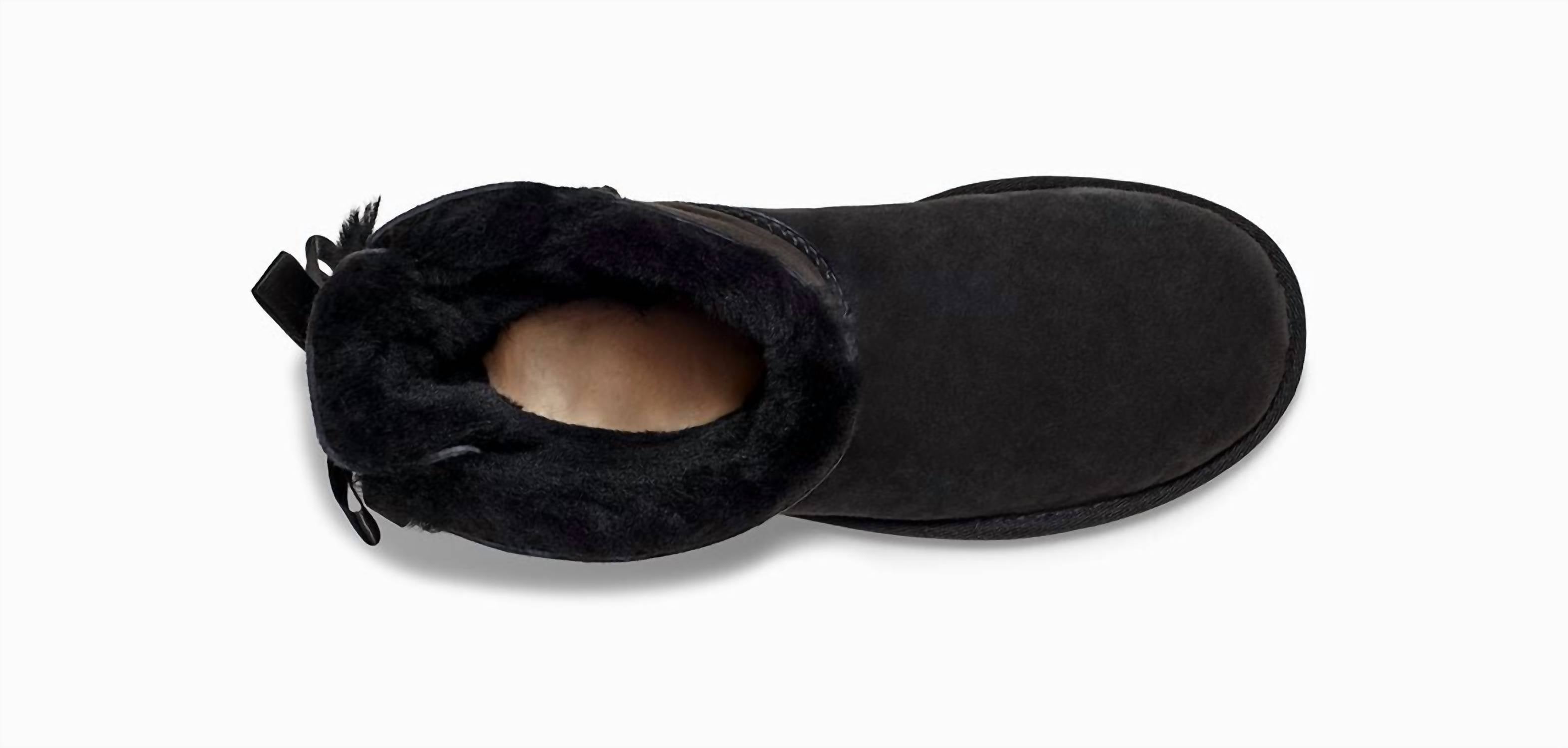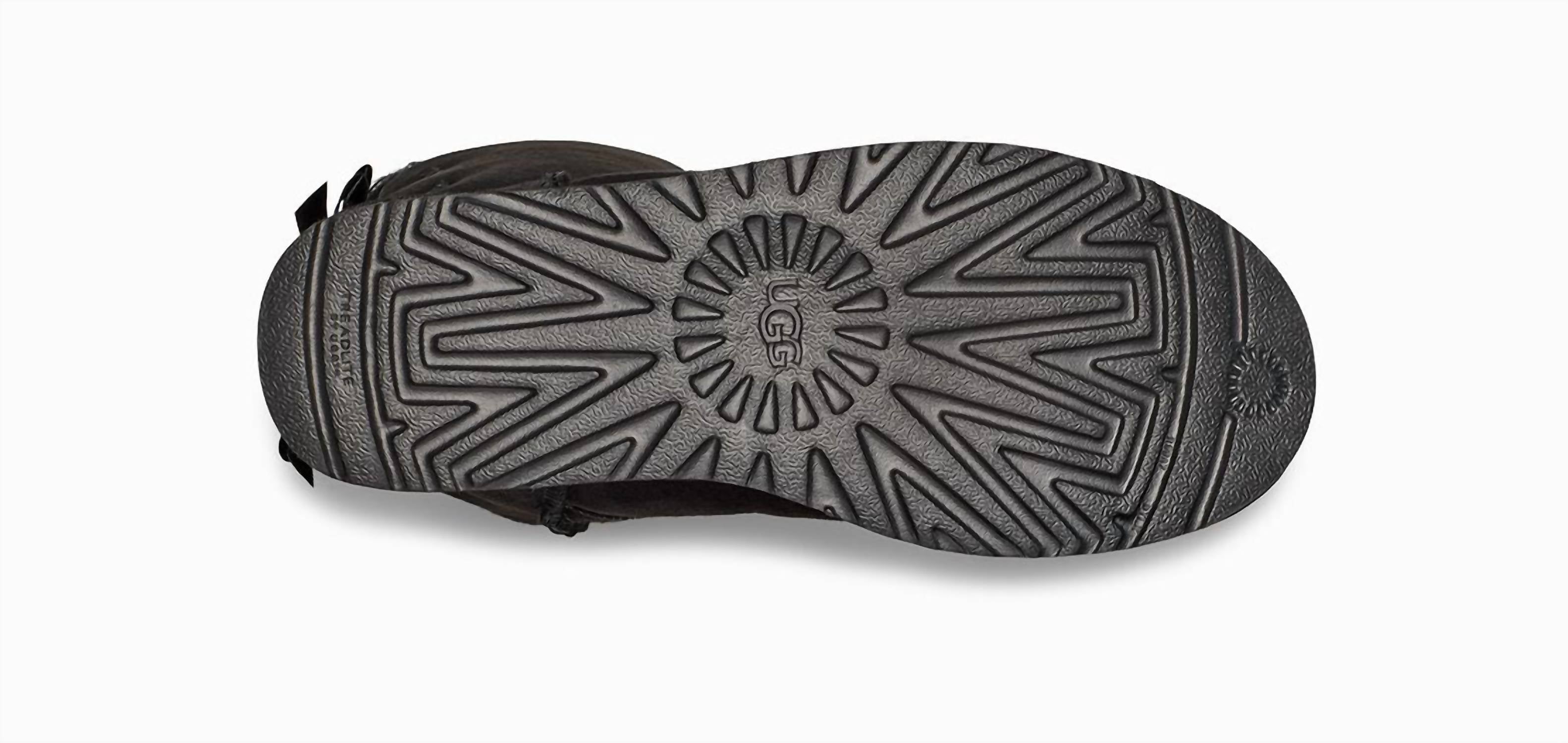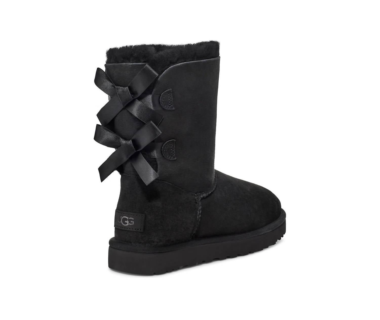 Rainboots so cute, you'll want to wear these even on the lightest drizzle days. Meet the Women's Bailey Bow II Casual Winter Boots by UGG, a stylish blend of practicality and elegance. These black boots feature a round toe and delight with fixed satin bows along the back shaft and an 8" shaft height, perfectly embodying a 90s fashion trend. Made from 17mm twinface sheepskin and lined with 17mm sheepskin, they're designed for superior warmth and comfort. Enhanced with Treadlite by UGG™ outsoles for cushioning and traction, they're ideal for winter travels or Thanksgiving gatherings. Crafted in Spain, they also demonstrate a commitment to empowering women in the workplace through HERproject support.