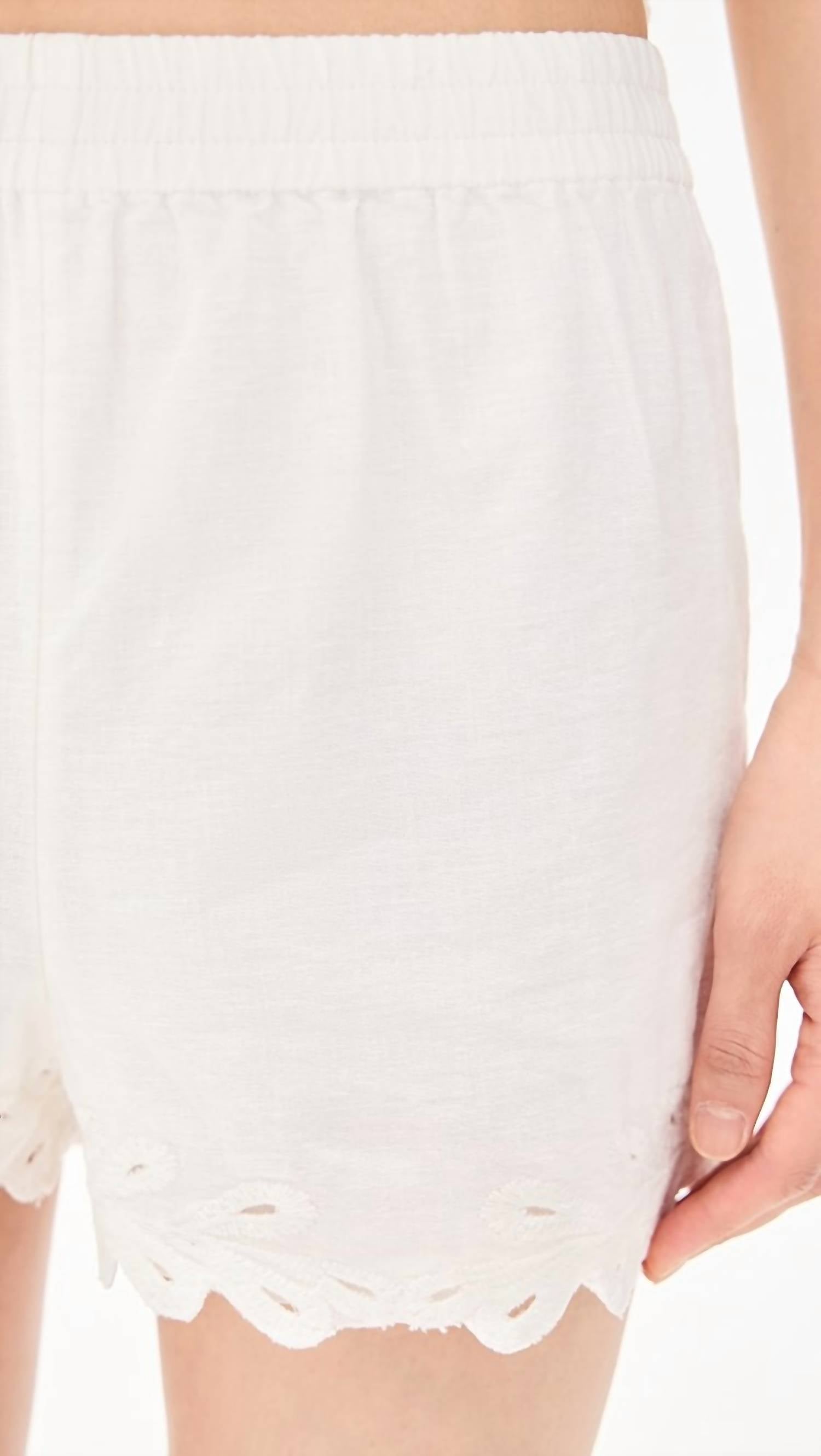 The Pesaro Shorts by Z Supply in crisp white are a must-have for spring and summer, offering a simple yet versatile style. Designed with a true-to-size fit, they feature a mid-high rise and a comfortable elastic waistband, providing ease for all-day wear. These shorts measure 13" from the waist, with a 2 1/2" inseam and a 26" waist in size XS. Composed of 77% cotton and 23% linen, they boast a pull-on closure and a minimalist textured pattern. Care: Hand wash.