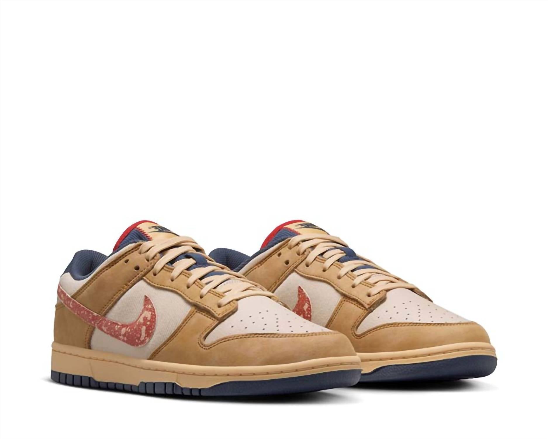 Elevate your footwear collection with the Nike Dunk Low Retro SE Sketch and Exploration Men's Shoe, a streetwear staple in Wheat/Burnt Sunrise-Sanddrift. Crafted from premium leather, this sneaker pairs a low-cut collar with a foam midsole for lightweight, responsive cushioning. Featuring a flat heel style and round toe shape, it boasts a classic rubber outsole with a pivot circle for durable traction. This versatile shoe is perfect for holiday parties and Spring occasions, providing comfort and style in medium width for adult men.