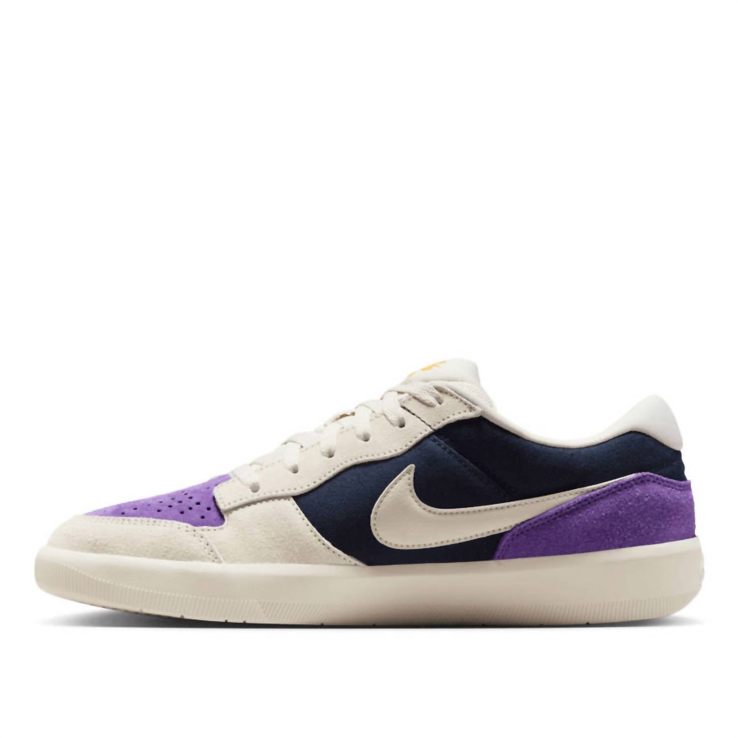 Step up your skate style with the Nike SB Force 58 Men's Skate Shoes in Obsidian/Wild Grape. These sneakers combine the durability of a cupsole with the flexibility of vulcanized shoes, crafted from a breathable mix of canvas and suede. Featuring a rubber sole with a cupsole stitch for exceptional durability, they ensure superior grip with tri-star shapes that expand and contract. Designed with heritage basketball flair, the perforated toe and iconic Swoosh guarantee a standout look perfect for any holiday party.