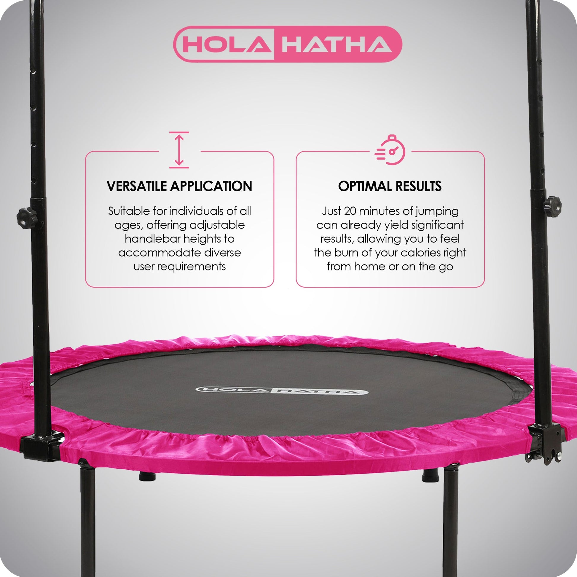 Leve sua rotina de exercícios a novos patamares incorporando o Mini Trampolim Dobrável HolaHatha de 48 Polegadas à sua rotina e embarque imediatamente em sua jornada rumo ao bem-estar.