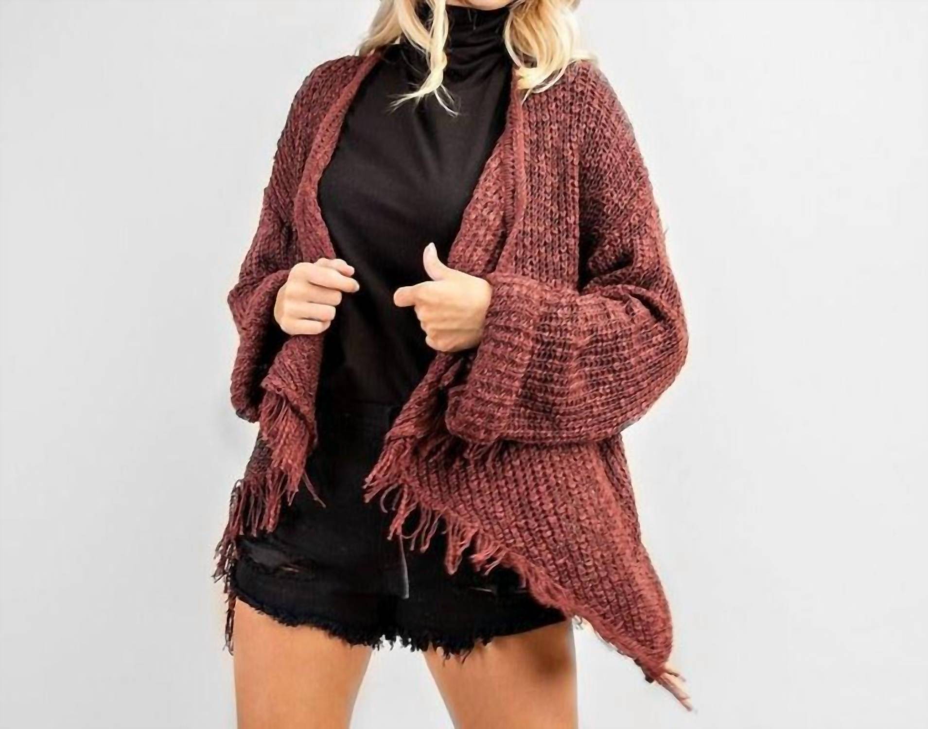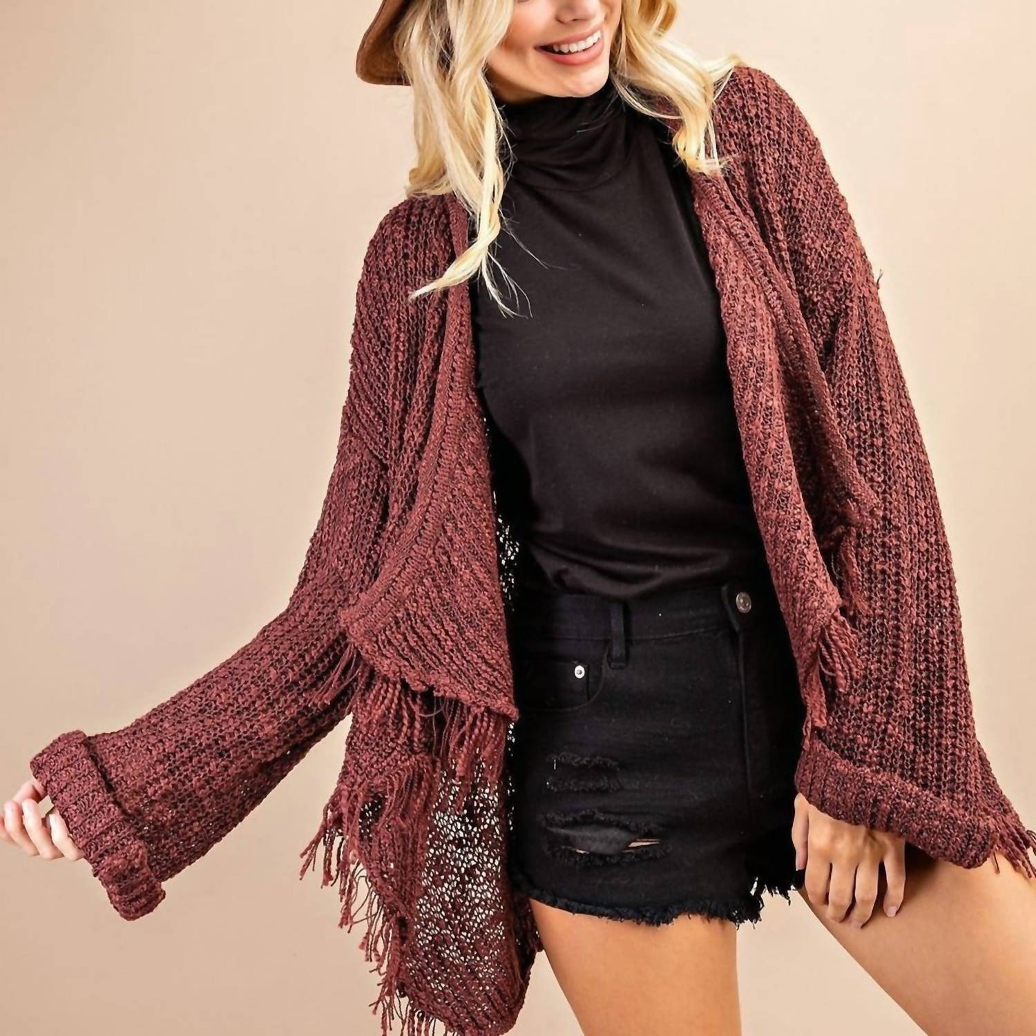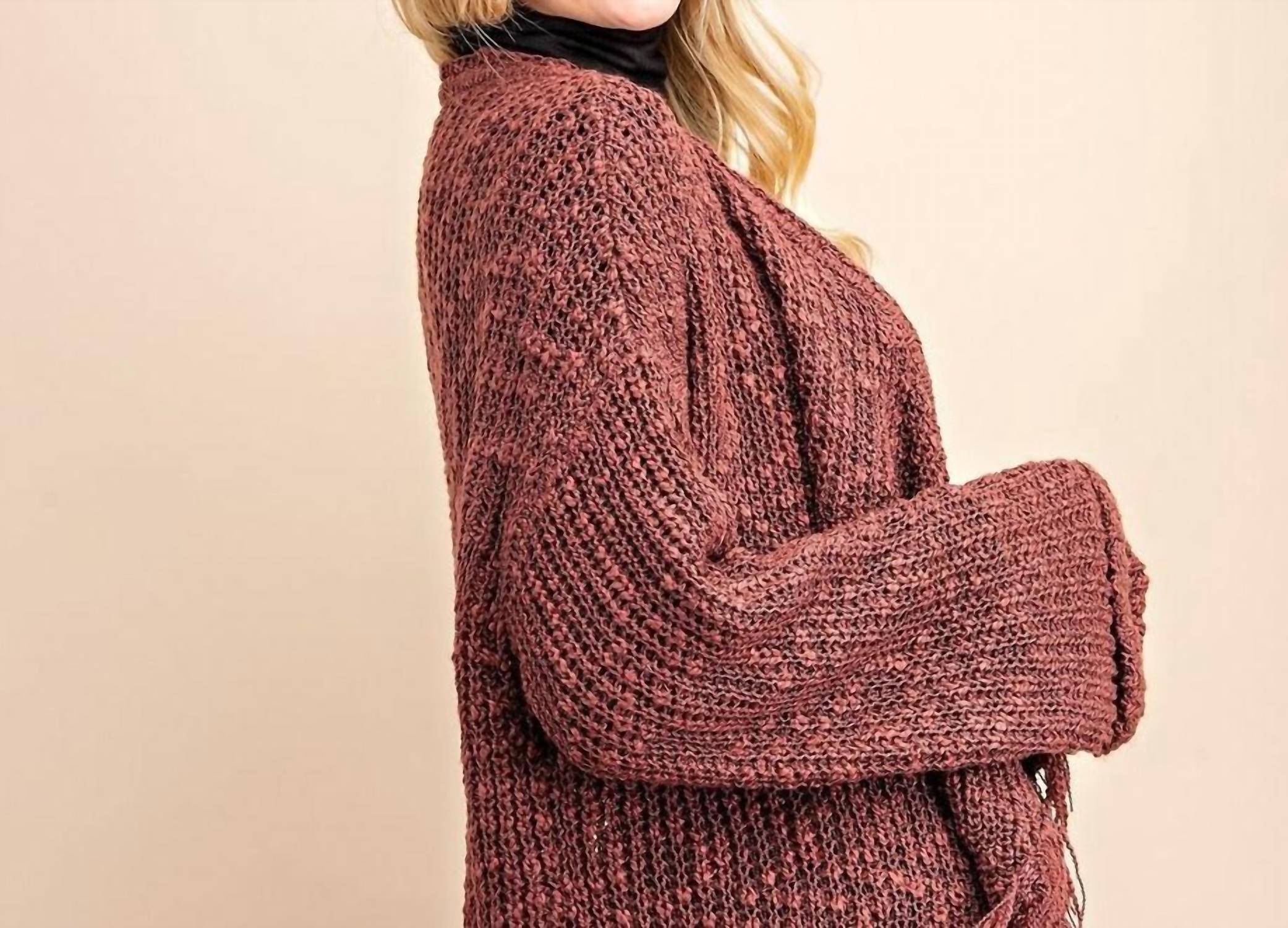 Use este adorável cardigan sobre qualquer camisola ou regata. Envolva-se em conforto com o Cardigan Drapeado Desfiado da 143 Story, uma escolha estilosa em um rico tom bordô. Este cardigan feminino oferece mangas compridas e um padrão texturizado com uma frente aberta elegante e bainha desfiada chique. Feito em 100% algodão, ele foi projetado para ser facilmente combinado com outras peças durante o outono e é fiel ao tamanho, disponível nos tamanhos P a G. As instruções de cuidado recomendam lavar à mão para manter seu excelente estado.