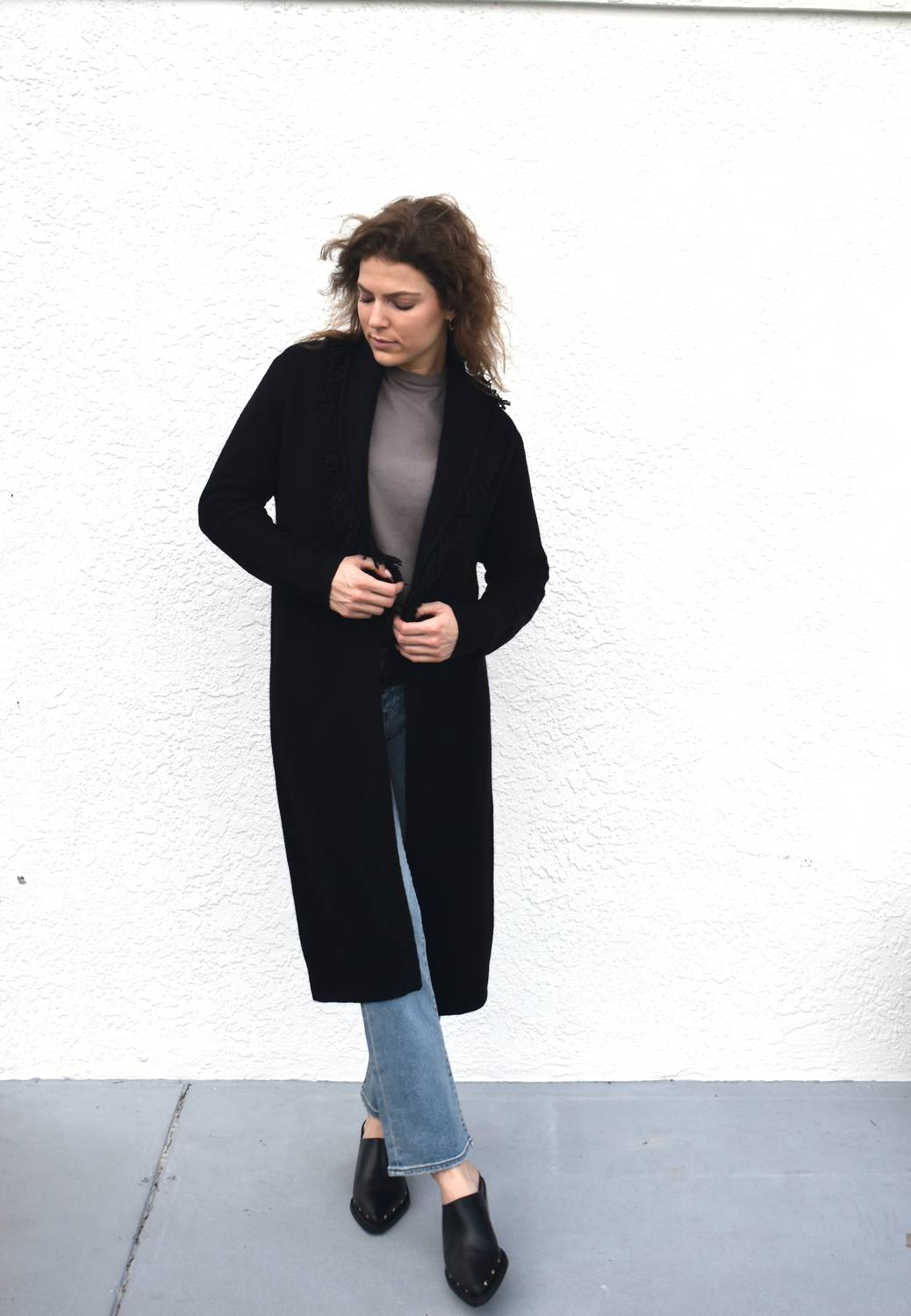 Este cardigan será um favorito para usar em rodízio de suéteres. Eleve seu guarda-roupa com o Cardigan Murray da 27 Miles Malibu, uma peça chique no estilo duster, perfeita para o outono. Confeccionado em uma mistura luxuosa de 70% lã e 30% cashmere, este cardigan preto apresenta mangas compridas, gola com franjas e costura texturizada para maior elegância. Fechamento: estilo pull-on. Instruções de cuidado incluem lavagem à mão com água fria e lavagem a seco profissional.