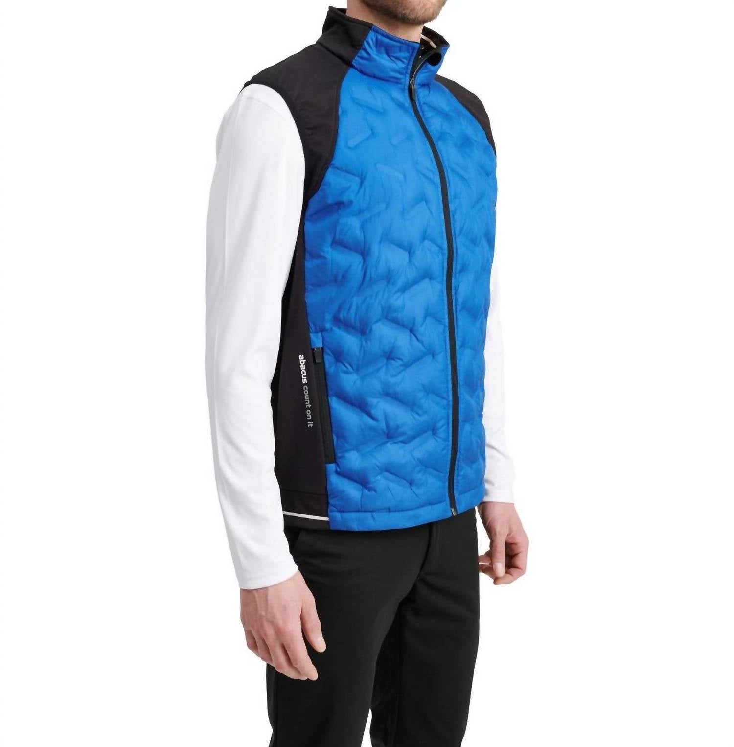 Stay warm and stylish with the Grove Hybrid Vest by Abacus Sportswear US. This sleeveless vest boasts a seamless quilted windproof fabric with padding on the front and back, ensuring warmth. Made from breathable polyester, it features stretchable fleece on the side panels and shoulders for enhanced movement. The full zip closure and two front zip pockets add functionality, while the contrast stripe at the body bottom and outside collar highlights its design.