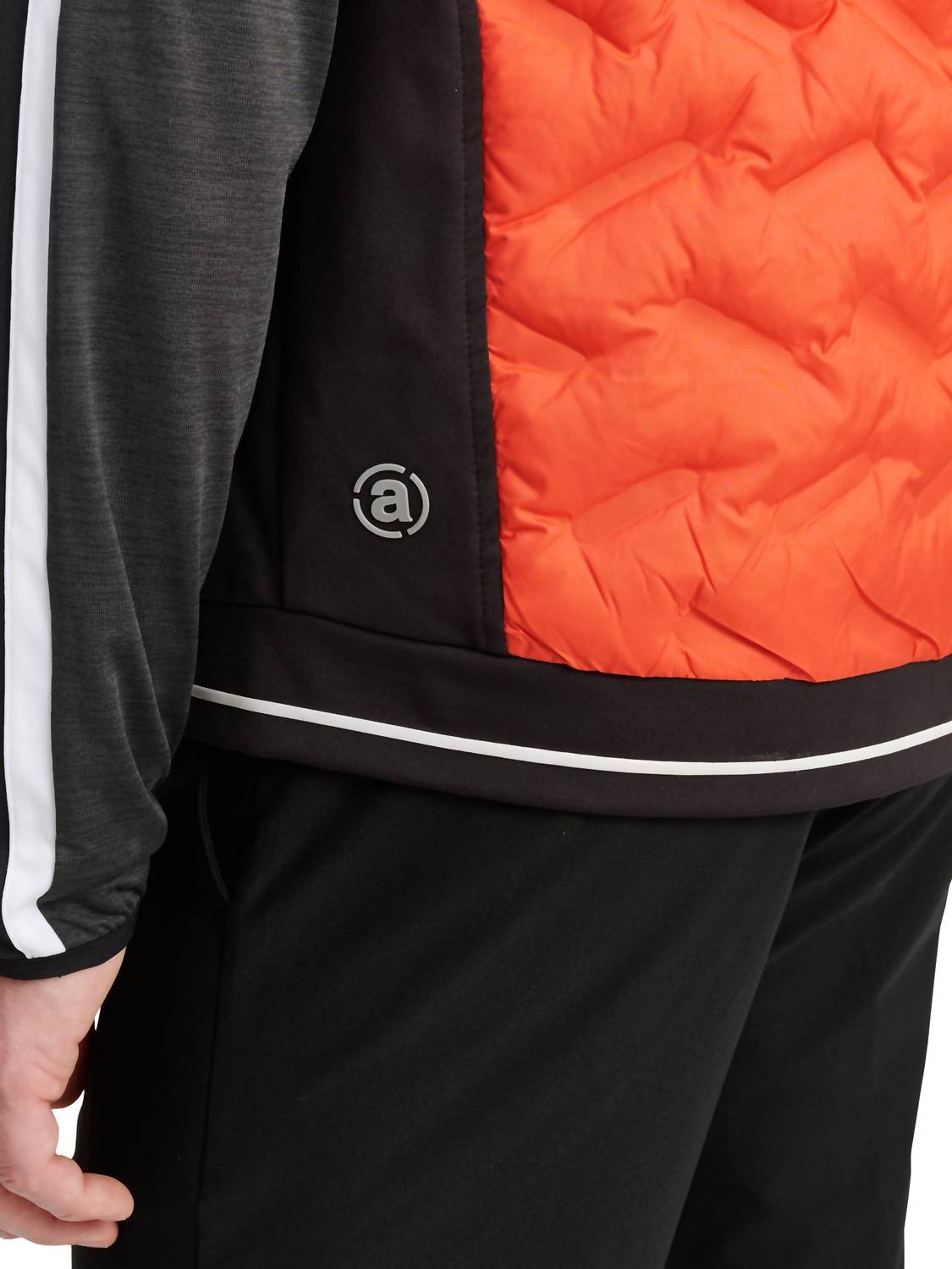 Experience warmth and mobility with the Abacus Sportswear US Grove Hybrid Vest, in a vibrant Sunset hue. As a sleeveless winter essential, it features a seamless quilted windproof fabric at the front and back, while stretchable fleece on the side panels and shoulders allows for better movement. Made from durable polyester with a full zip closure and practical zippered pockets, it is as functional as it is stylish. Accented by a contrast stripe at the body bottom and collar, complete with the Abacus logo details, this vest makes for an ideal patterned piece to elevate your winter wardrobe.