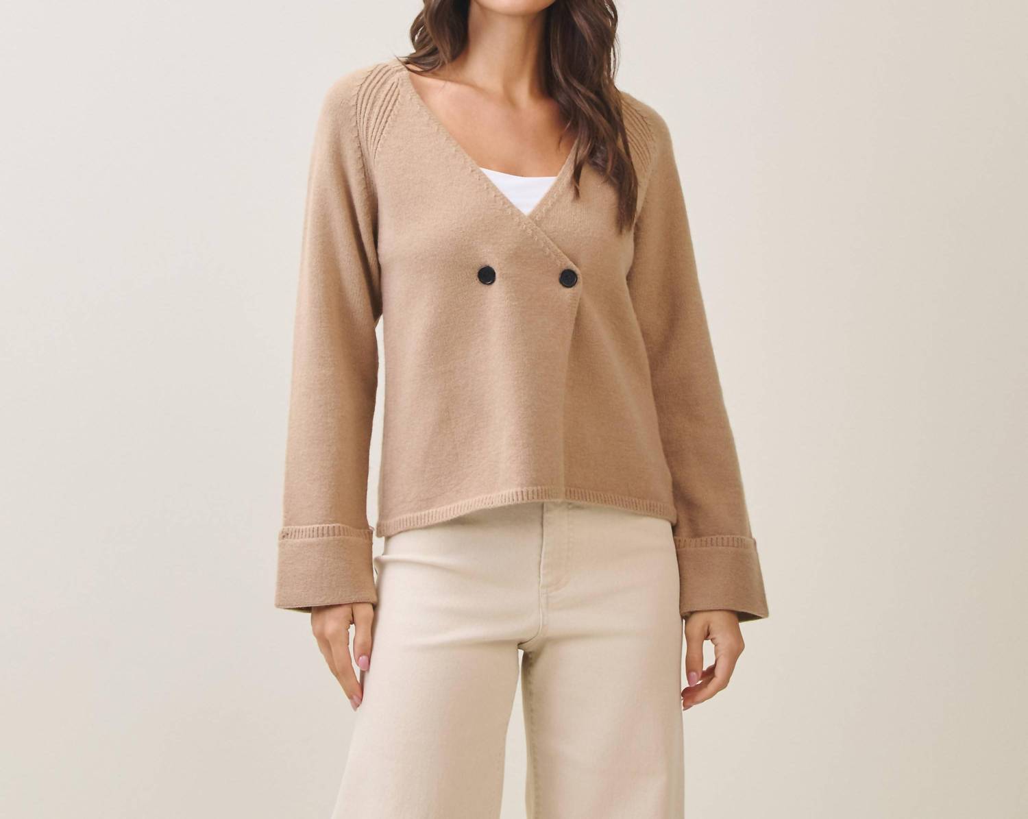 A classic fit that works just as good buttoned as it does left open. Introducing the Double Button Cardigan by ABLE, a minimalist essential in a rich mocha color, perfect for the fall season. This women's cardigan features a V-neck and long sleeves, offering both style and warmth on vacation or during Thanksgiving gatherings. The solid pattern and button closure add a touch of elegance to your outfit.