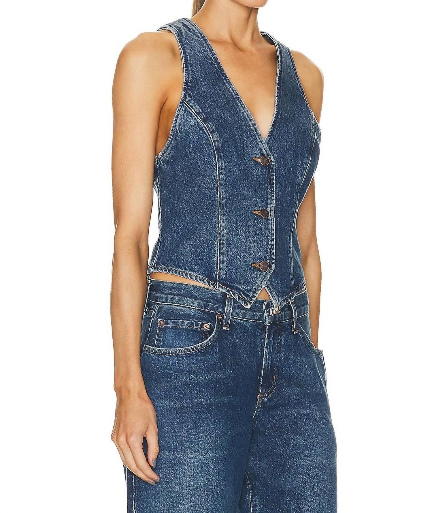 Tom elegante e sofisticado da Ambition. Colete sem mangas com estampa lisa. Confeccionado em uma mistura de 67% algodão orgânico, 22% liocel reciclado e 11% algodão reciclado pós-consumo. Tecido jeans estruturado para um visual elegante. Fabricado na Turquia. Possui fecho prático com botões frontais e leve detalhe de vincos. Lavável à máquina.