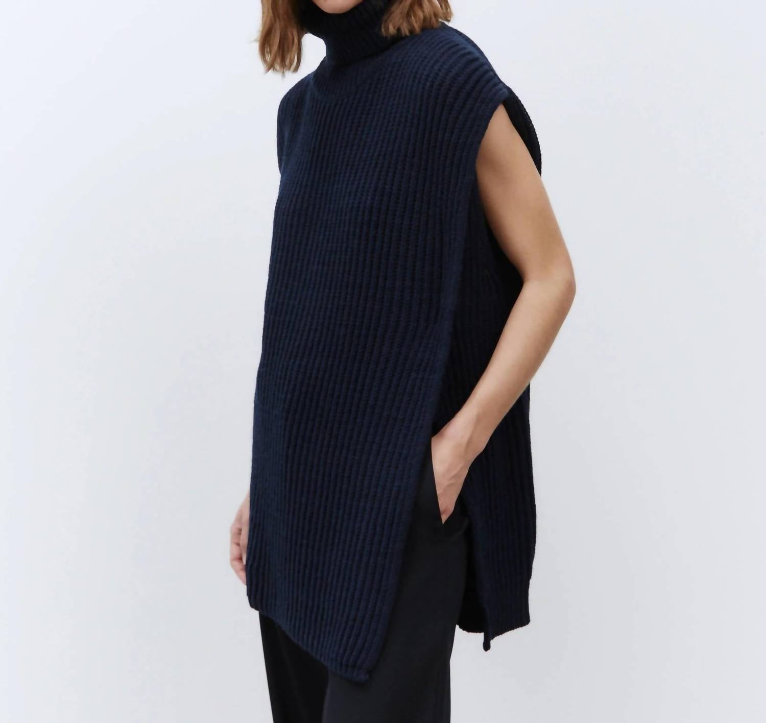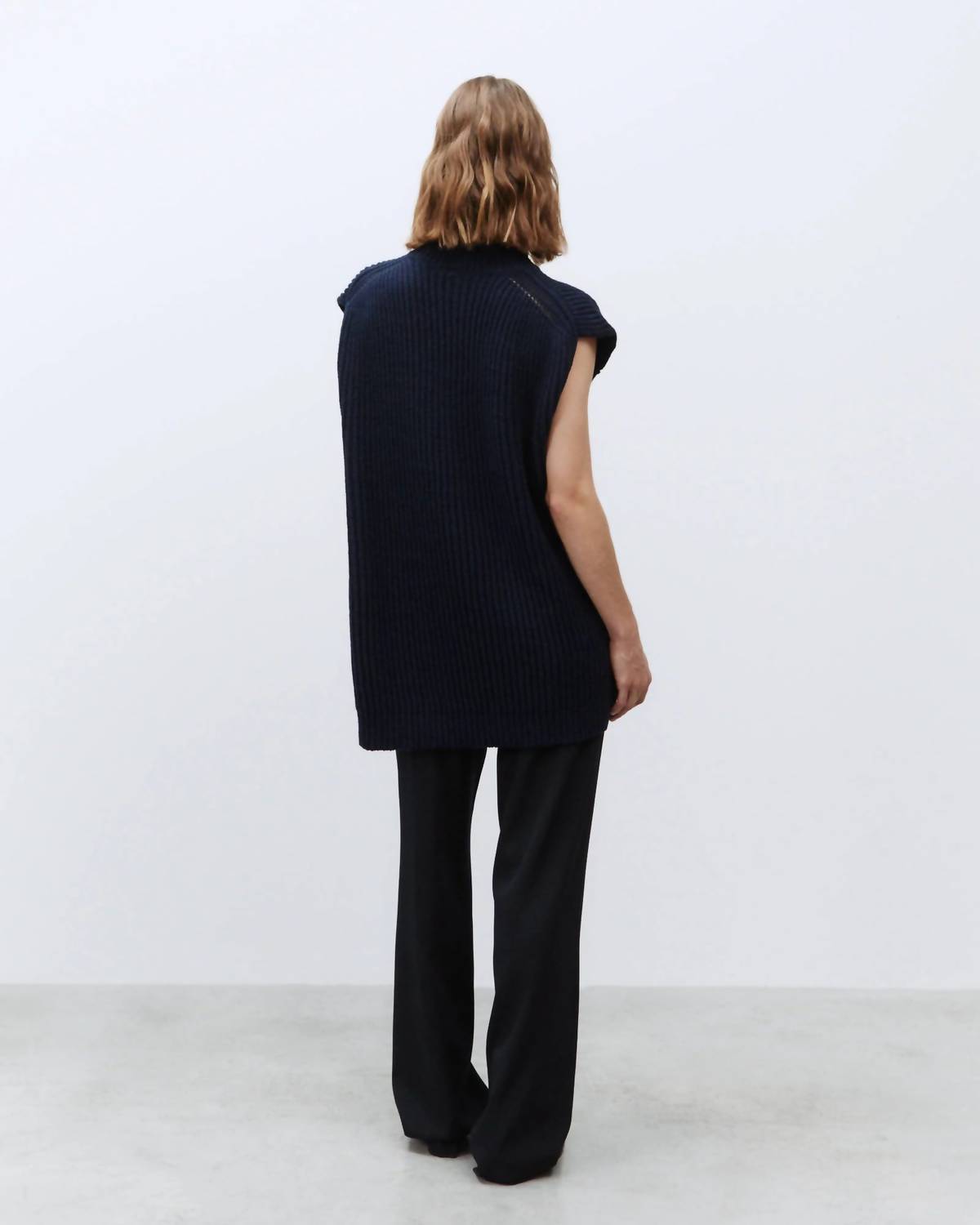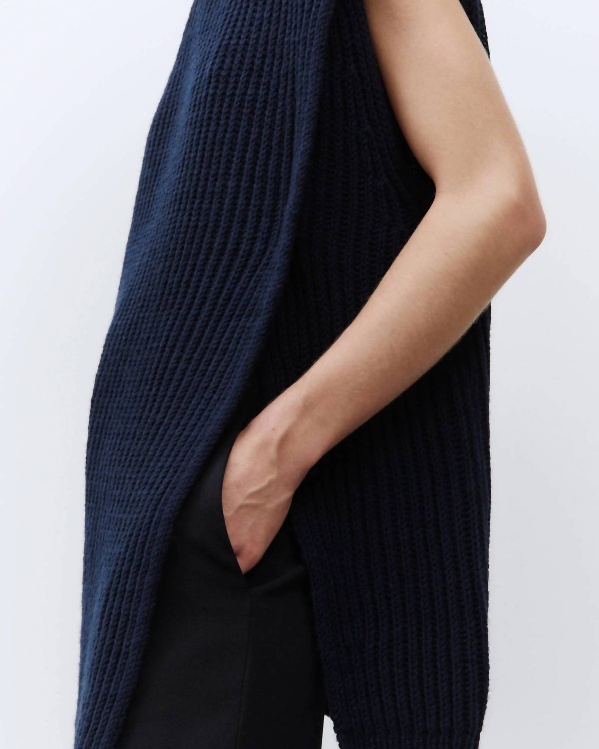Chic stunning Notte color. Crafted in a wool blend with a ribbed texture. Italian-made sweater vest features a caped look and open sides for a refined touch. Composed of 50% Wool, 50% Acrylic. Pull-on style. Dry clean only.