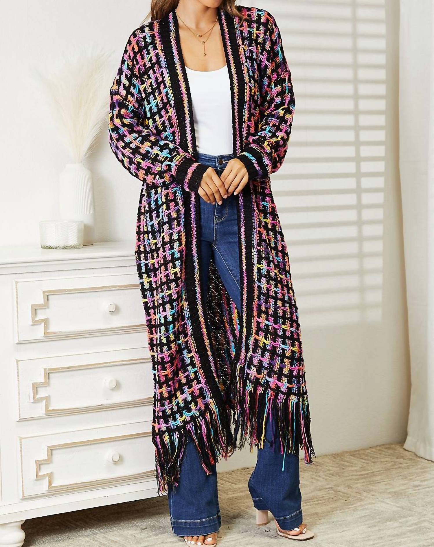 Abrace o estilo boêmio chique com o Cardigan Multicolorido com Frente Aberta e Franjas da Angel Wings by Lucy. Este cardigan de manga comprida é confeccionado em 100% acrílico, apresentando uma estampa multicolorida divertida e uma bainha com franjas moderna. Possui fecho pull-on para um uso sem esforço e é importado com instruções de cuidado que recomendam lavar à máquina com água fria e secar em temperatura baixa. Disponível nos tamanhos P a 3XL, com medidas detalhadas para garantir o ajuste perfeito para qualquer conjunto de jantar de primavera.