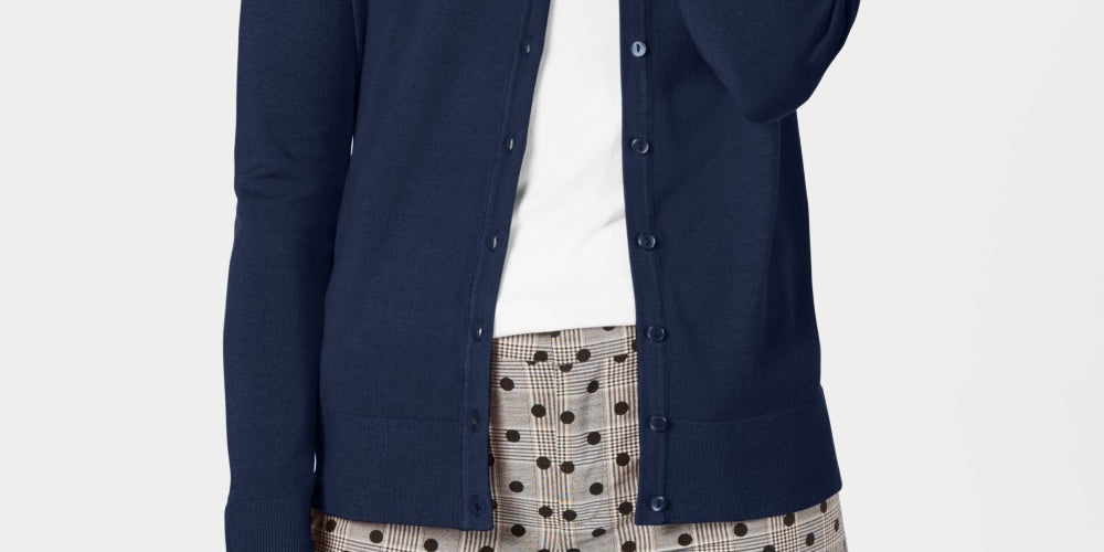Cardigan feminino com gola redonda Charter Club, azul, tamanho pequeno, médio