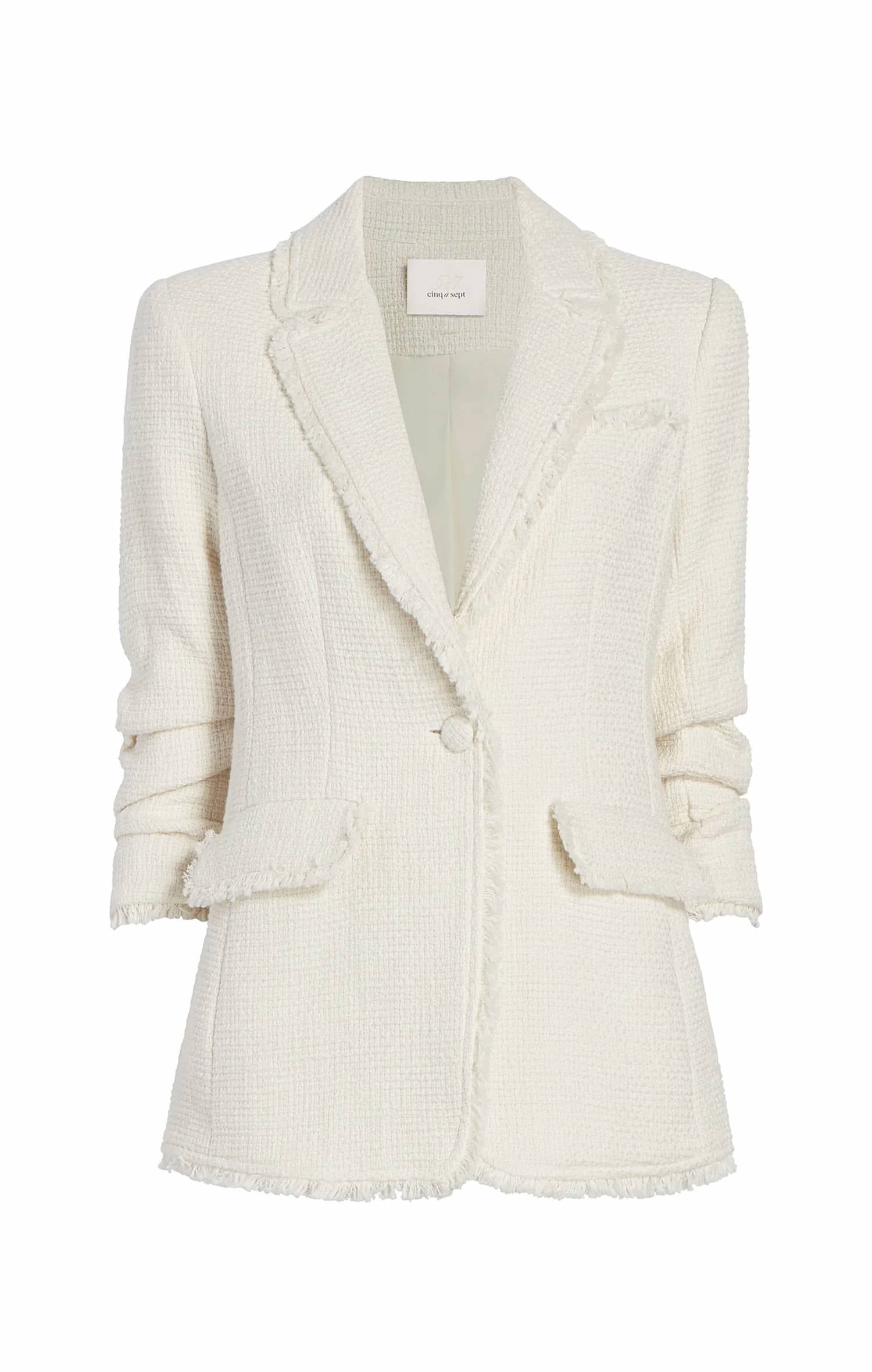 Apresentamos o Blazer Boucle Khloe da Cinq a Sept, confeccionado em um sofisticado tom de gardênia para um look marcante. Este blazer apresenta mangas três quartos e gola careca, com corte ajustado em tecido bouclé texturizado. Composição: 63% algodão, 33% poliéster, 4% viscose. Comprimento: 68,58 cm a partir do ombro. Origem: Fabricado na China. Tipo de fecho: Um botão. Cuidados: Lavagem a seco somente. A peça inclui bolsos frontais falsos e uma abertura nas costas para maior elegância.