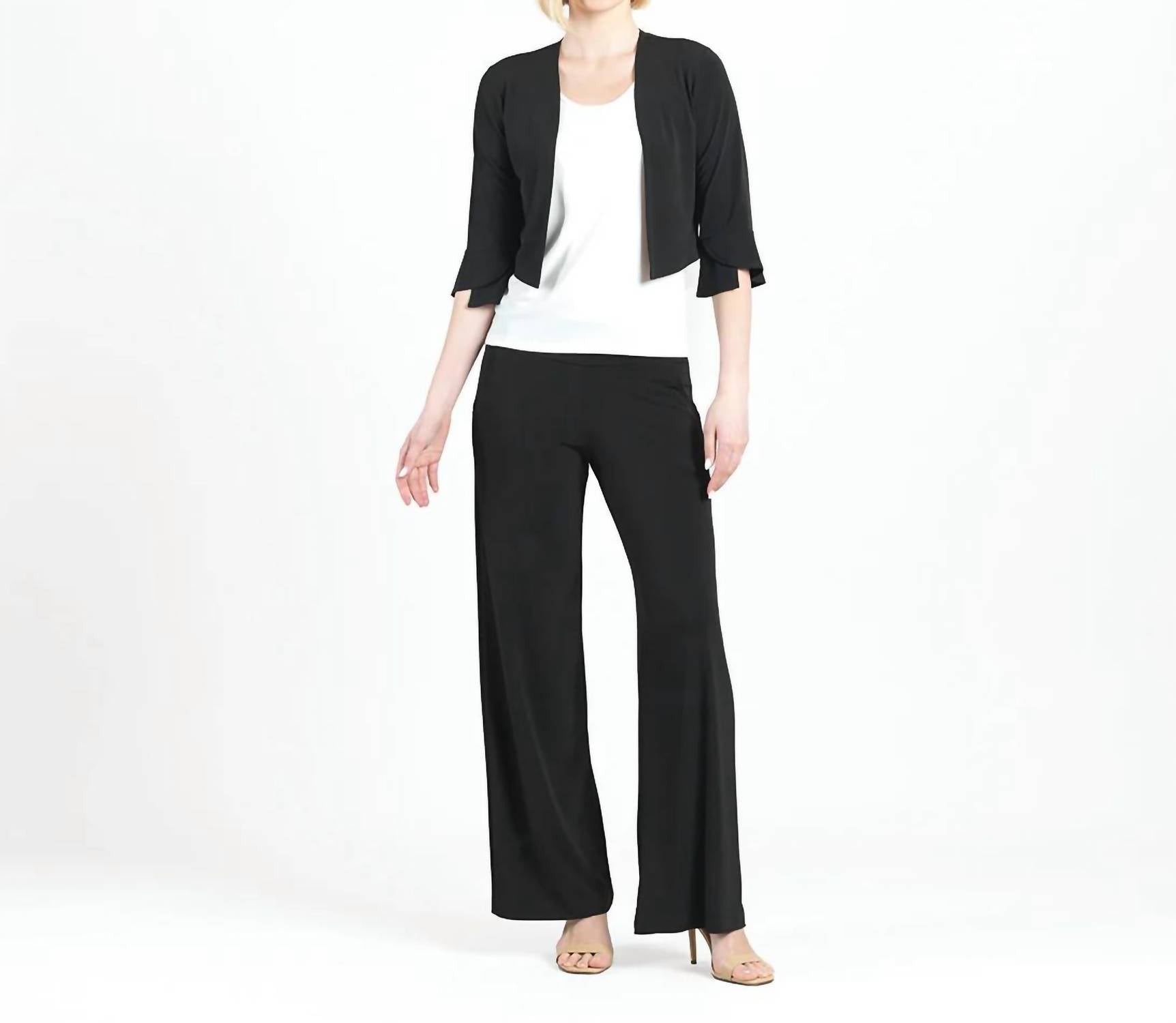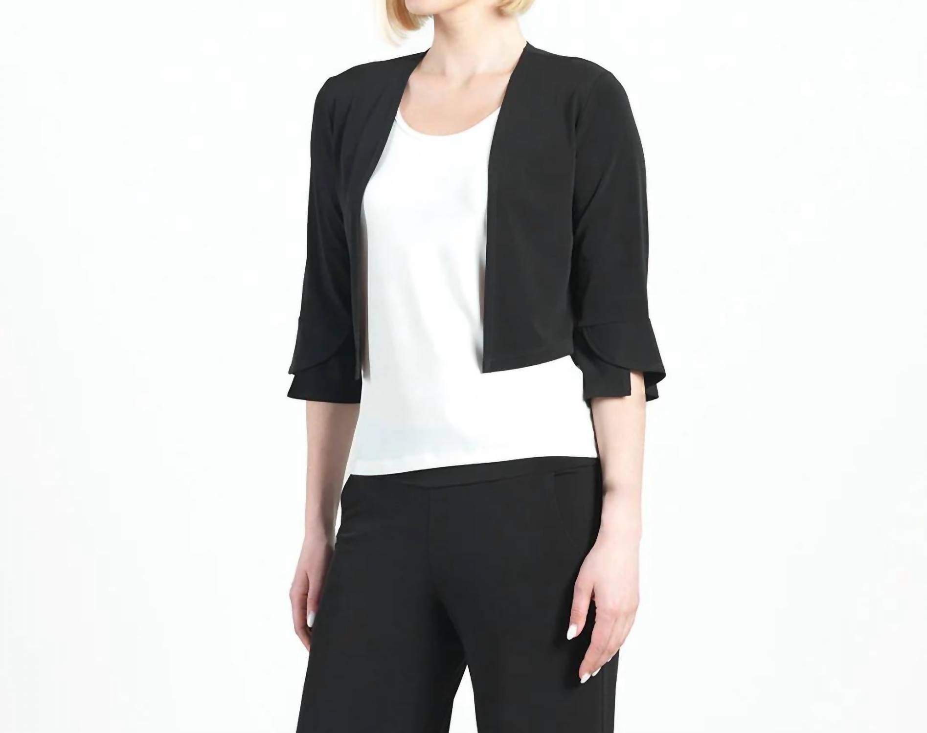 Cardigan chique com mangas tulipa com aberturas três quartos e bainha curta. Confeccionado em poliéster ultraleve e antirrugas. Projetado para conforto e fácil cuidado. Lavar à mão em água fria ou na máquina em ciclo delicado; pendurar para secar.
