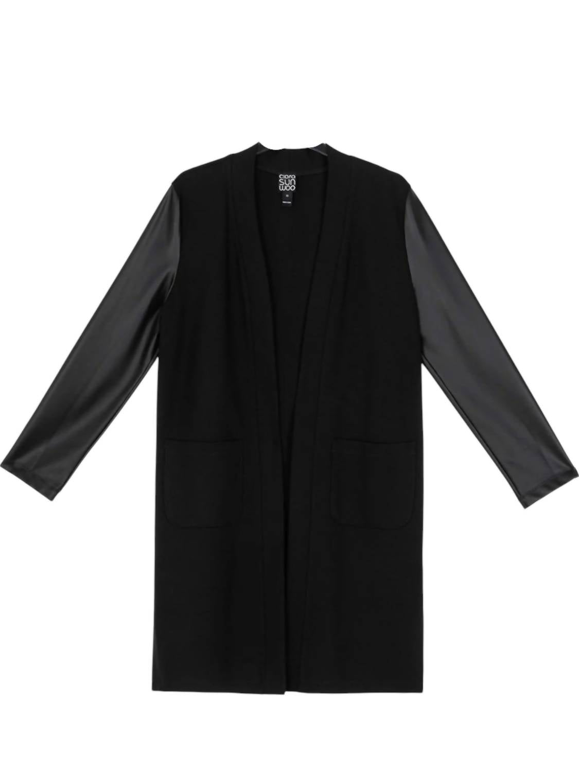 Ponte macia e estruturada. Acabamento em couro líquido com brilho suave. Adequado para veganos. Excelente retenção de forma. Revestimento semelhante a couro sintético nas mangas e na costura da lombada. 70% poliéster, 20% rayon, 10% elastano. Secagem rápida e fácil manutenção.