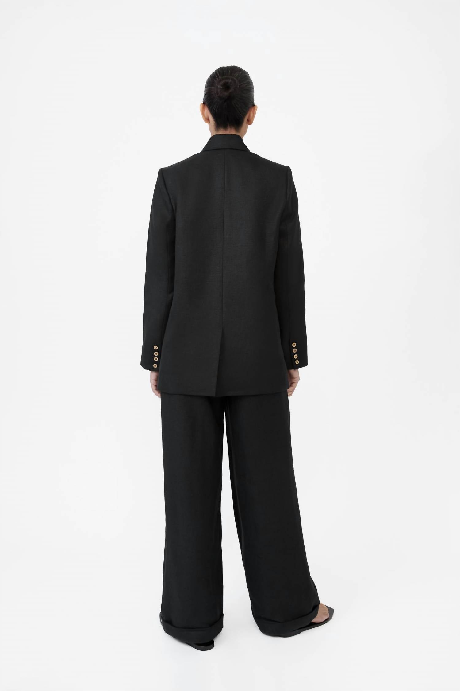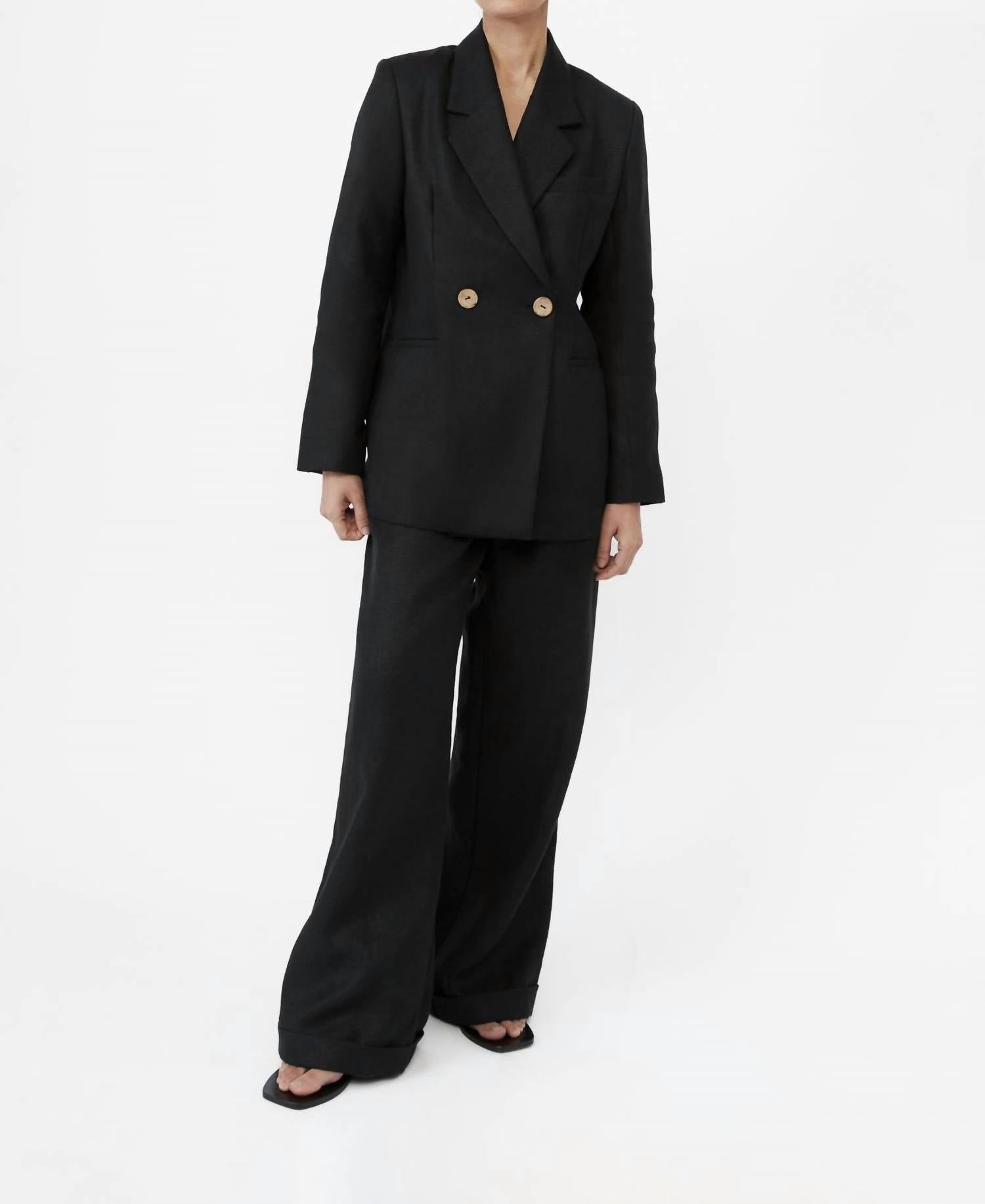 Um blazer tão versátil que você pode usá-lo no escritório ou combiná-lo com jeans para um visual mais casual. Eleve seu guarda-roupa com o Blazer Trespassado da Dāl the Label, uma peça essencial da moda sustentável em preto clássico. Com mangas longas e uma mistura consciente de 100% cânhamo e poliéster reciclado, esta peça oferece estilo e sustentabilidade. Apresentando uma silhueta estruturada com lapelas entalhadas e bolsos funcionais, ele fecha com um botão de coco para um toque único. Perfeito para eventos noturnos, este blazer deve ser lavado a seco.