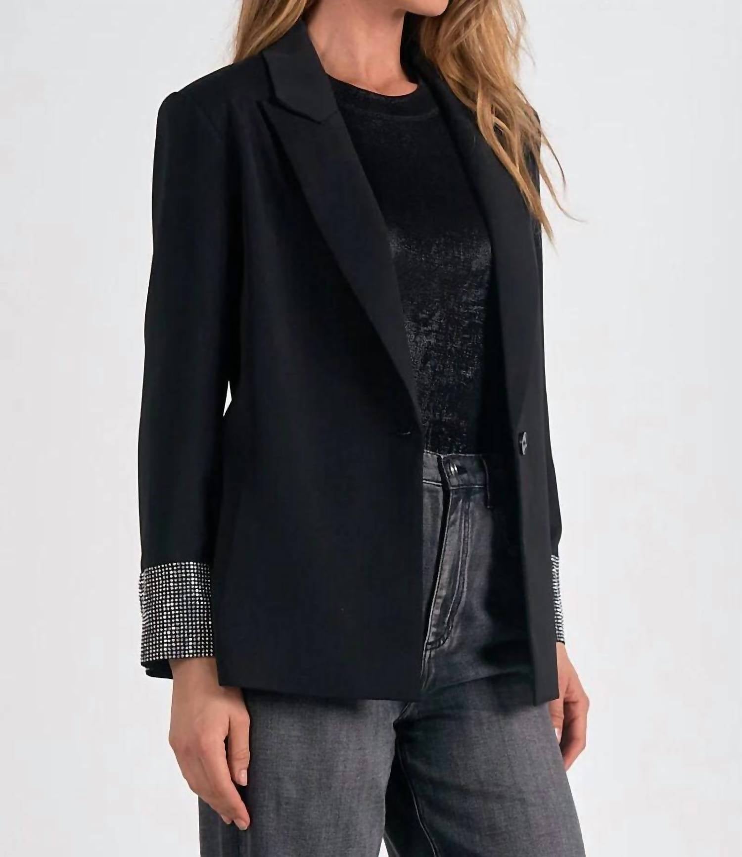 Uma versão elevada do seu blazer clássico favorito. Eleve seu visual profissional com o Blazer Eloise com Punhos de Strass da ELAN, uma mistura de sofisticação e glamour sutil em preto clássico. Este blazer apresenta mangas longas adornadas com punhos deslumbrantes de strass e um decote elegante. Projetado com fecho de botão para um ajuste sob medida e sem bolsos para um acabamento elegante. Ideal para mulheres que buscam uma peça com estampa sólida para realçar seu visual.