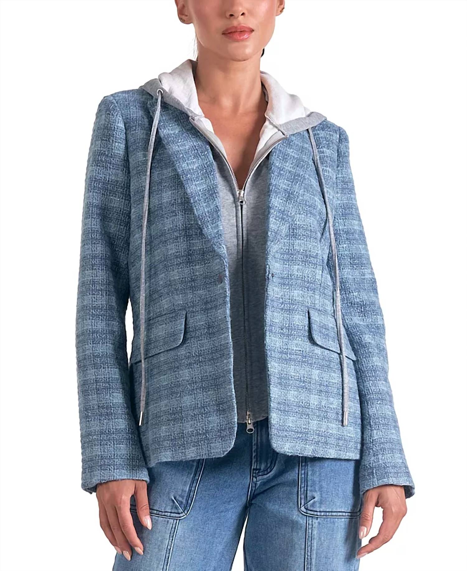 Eleve seu guarda-roupa com o Blazer com Capuz e Manga Longa em Camadas ELAN Plaid, na elegante cor Azul e Prata. Esta peça única combina um material de poliéster forrado com um capuz cinza removível com capuz sintético que se prende por zíper, permitindo que você alterne de um visual sofisticado para um casual sem esforço. Projetado com um fecho de botão clássico e bolsos práticos, oferece estilo e funcionalidade. Cuide desta peça optando pela lavagem a seco para manter sua aparência impecável.