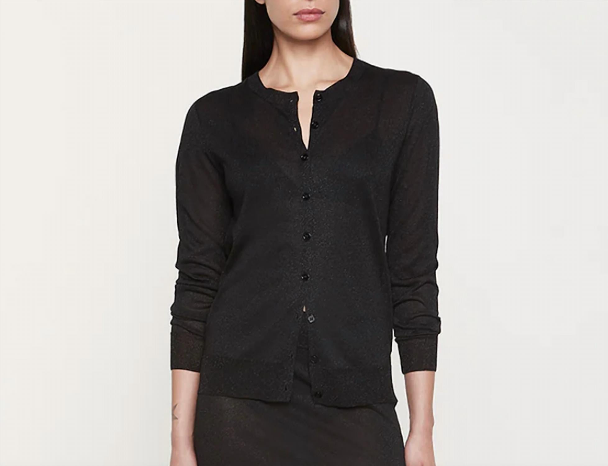 Apresentamos o Cardigan Lamé da Enza Costa, uma peça preta elegante, perfeita para usar em camadas nas festas de fim de ano. Este cardigan apresenta mangas longas, confeccionado em uma mistura leve de 73% viscose, 16% nylon e 12% fios metálicos para um toque de brilho. Fechamento: Delicado fecho de botão na frente. Fabricado na China.