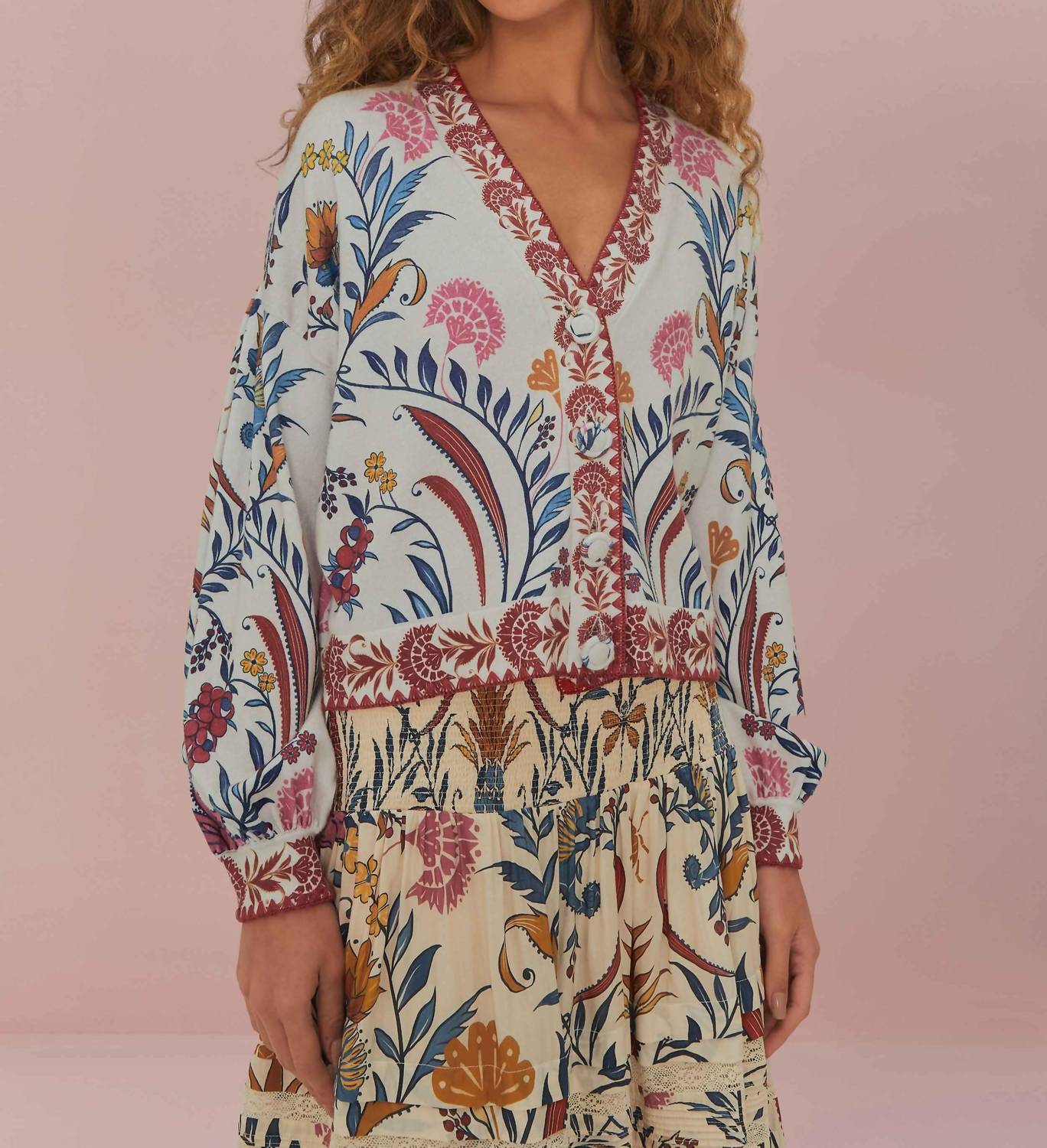 Use este adorável cardigan sobre qualquer camisola ou regata. O Cardigan de Tricô Romantic Lightness da FARM RIO incorpora uma estética romântica perfeita para ocasiões de primavera. Com mangas longas e decote em V, este cardigan apresenta uma estampa de tirar o fôlego em tons de azul, vermelho escuro e creme. É uma peça versátil para diversos ambientes, como a igreja, adicionando um toque de elegância a qualquer look. O país de origem e as instruções de cuidado não são especificados, permitindo um foco perfeito no design artístico do cardigan.