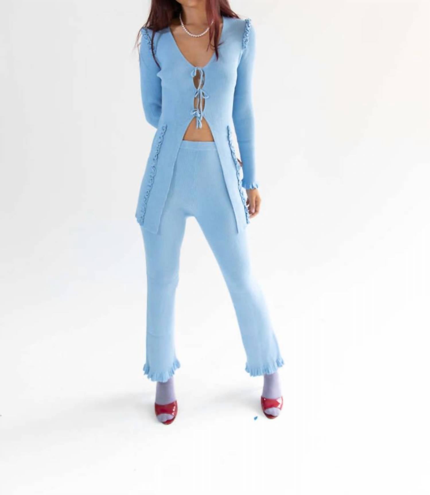 Um ajuste clássico que funciona tão bem abotoado quanto aberto. Apresentamos o Cardigan Longo Cleo da find me now, confeccionado em um tom céu sereno com uma mistura de viscose texturizada para maior conforto. Este cardigan feminino possui mangas compridas e um fecho de amarrar estiloso, tornando-o uma peça fácil de combinar com qualquer guarda-roupa. O material canelado e a delicada barra com babados adicionam um toque extra de elegância ao seu design. Cuide desta peça lavando-a com água fria e com cores semelhantes e secando na horizontal.