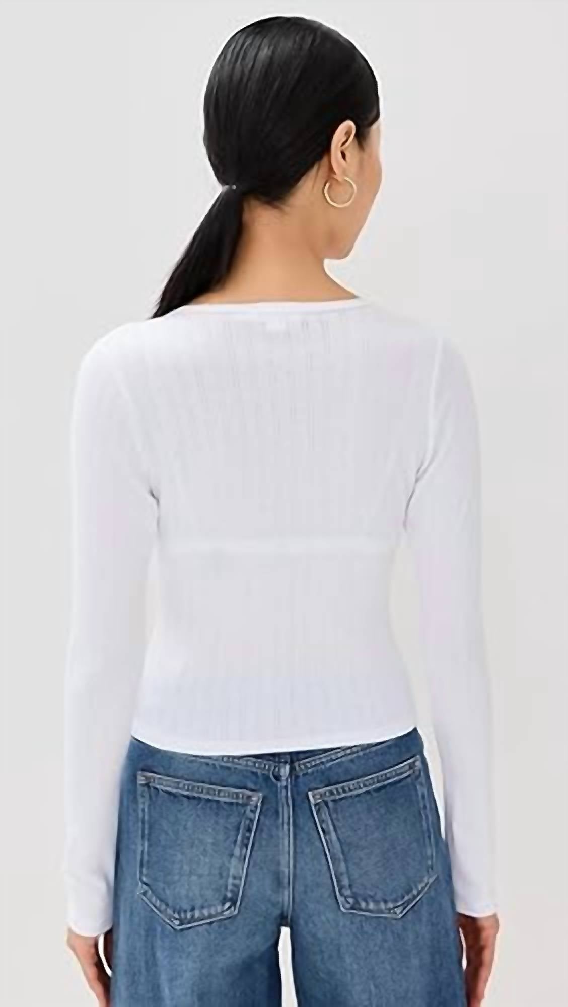 Eleve suas combinações com o Cardigan Pointelle da GOOD AMERICAN, uma adição chique a qualquer guarda-roupa em branco atemporal. Este cardigan de manga comprida, de cor sólida, possui decote em V e um prático fecho de botão para facilitar o uso. Confeccionado com 64% poliéster reciclado, 33% algodão e 3% elastano, ele combina sustentabilidade com conforto. Cuidar é fácil: basta lavar na máquina com água fria para uma manutenção sem esforço.