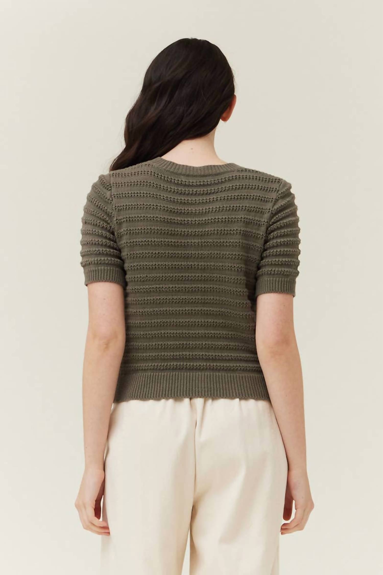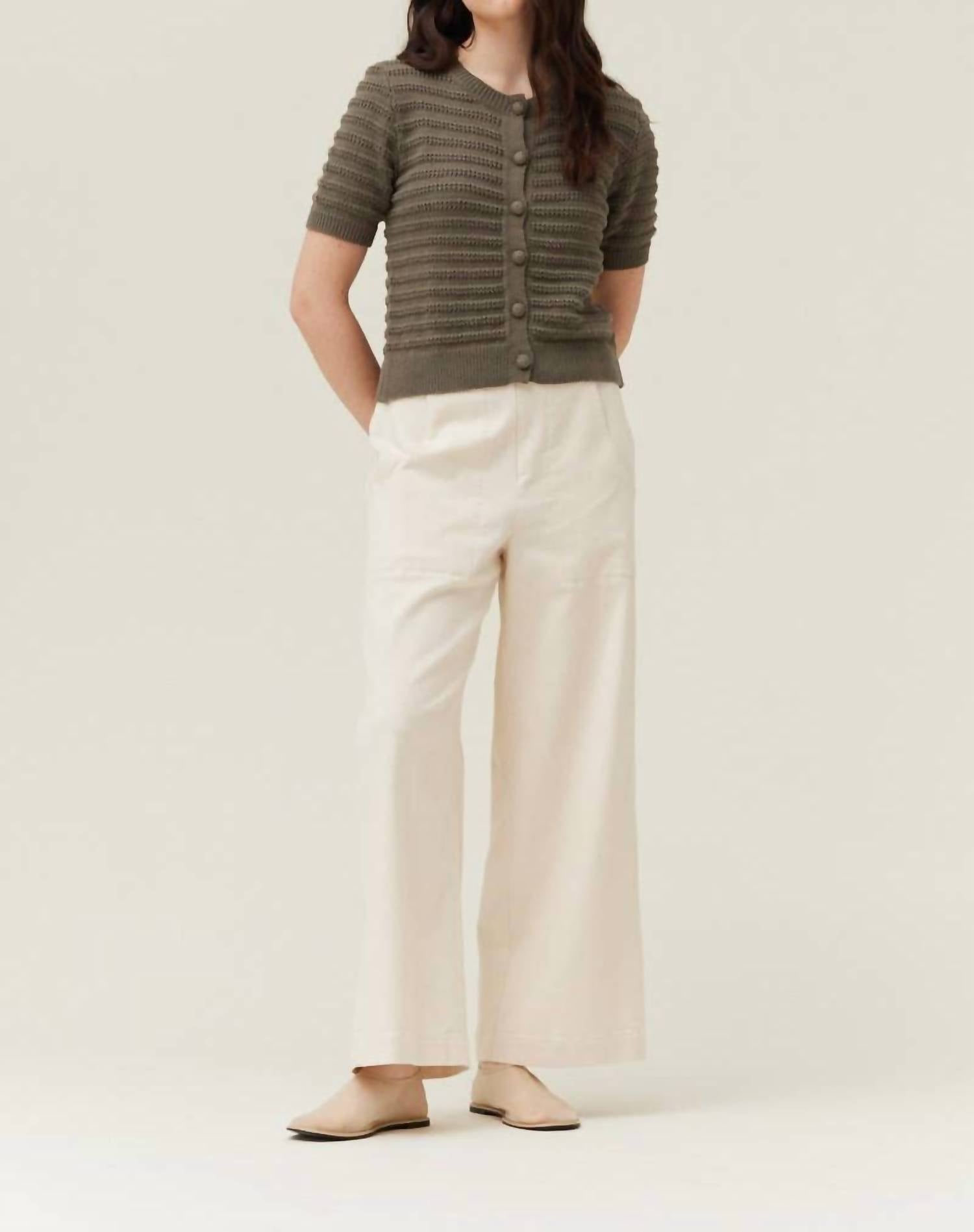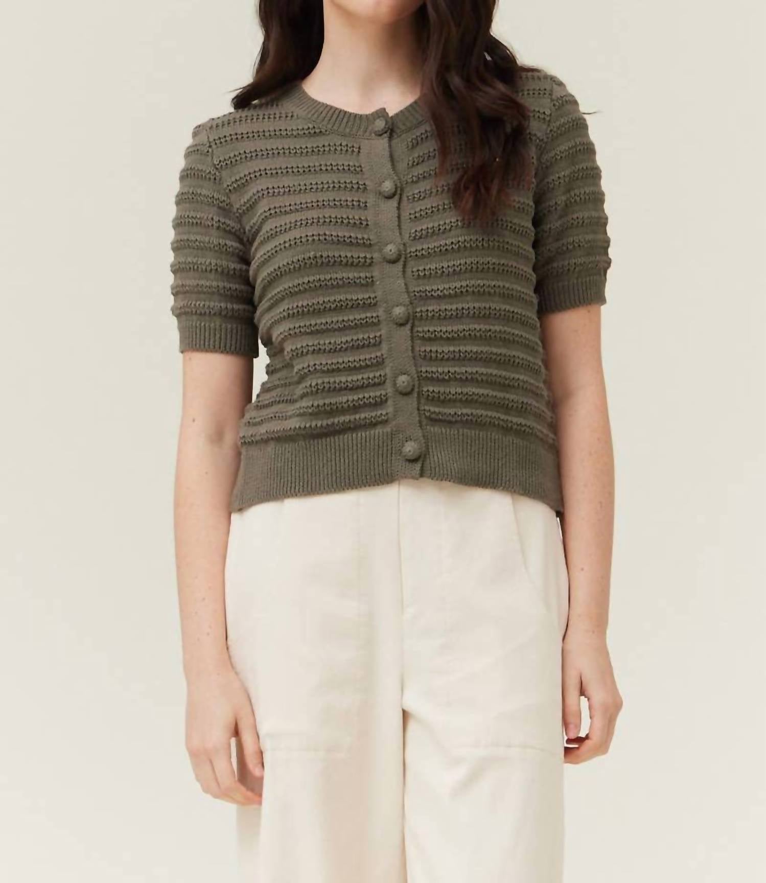 Um ajuste clássico que funciona tão bem abotoado quanto aberto. Eleve seu guarda-roupa com o Cardigan Cropped de Manga Curta da GRADE & GATHER na elegante cor Dry Sage. Esta peça elegante apresenta uma textura de malha de crochê com fecho de botão clássico, proporcionando um visual refinado e casual. Confeccionado em 100% algodão pré-lavado, este cardigan combina perfeitamente com qualquer conjunto. Lave-o delicadamente em água fria e deixe secar na horizontal; não é necessário passar.