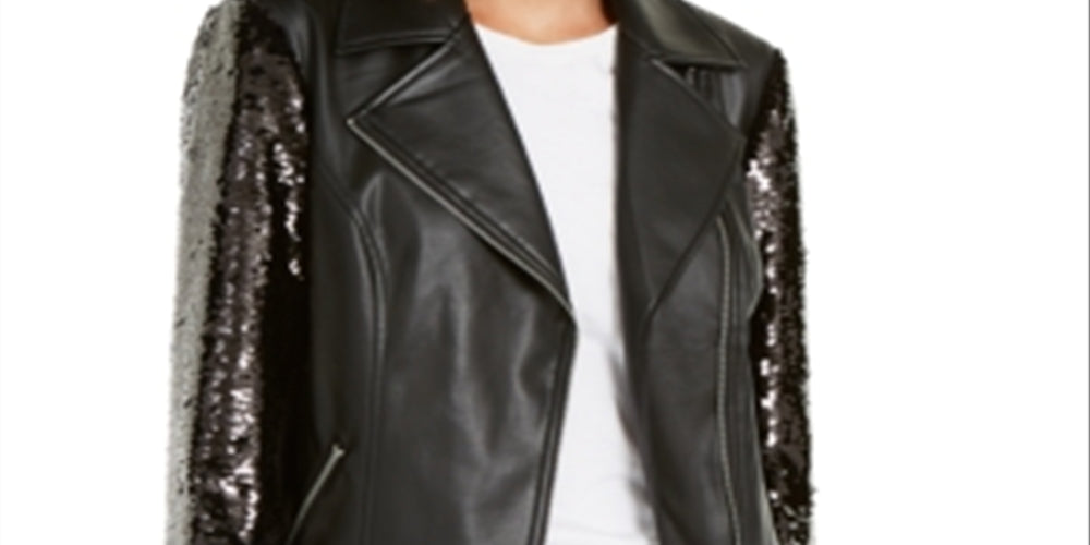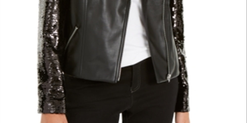 Jaqueta feminina INC de couro sintético com lantejoulas, preta escura, tamanho pequeno