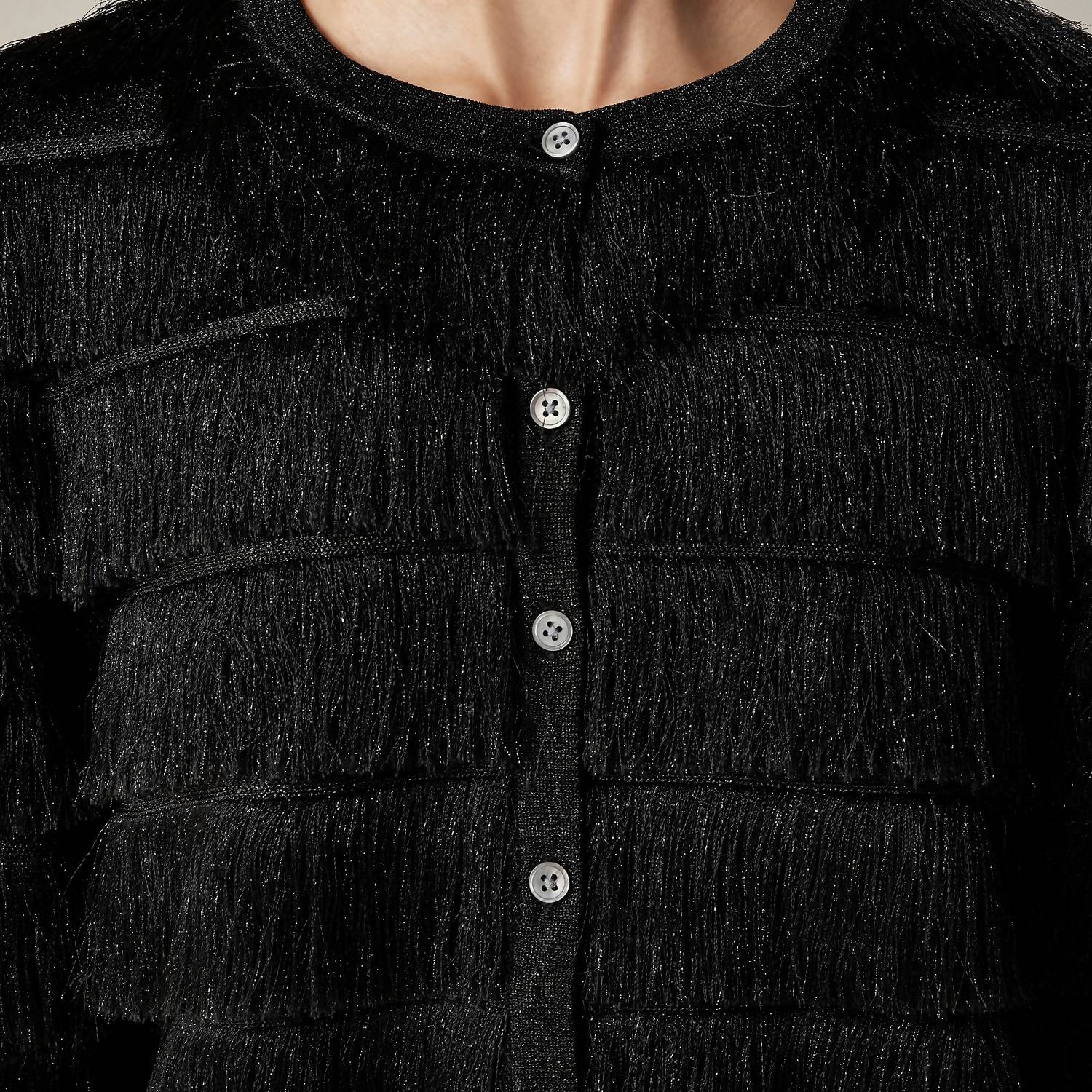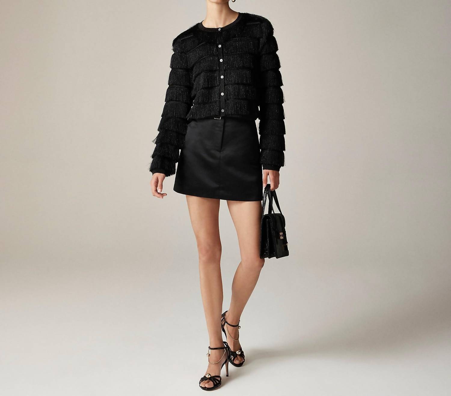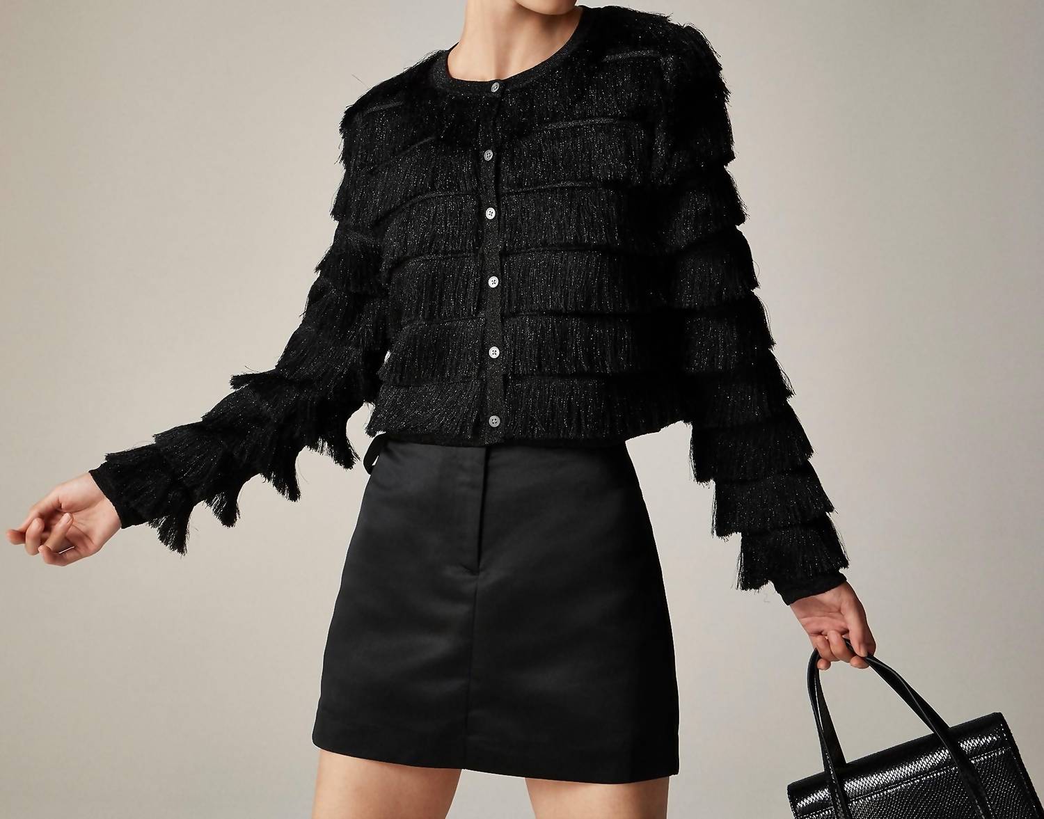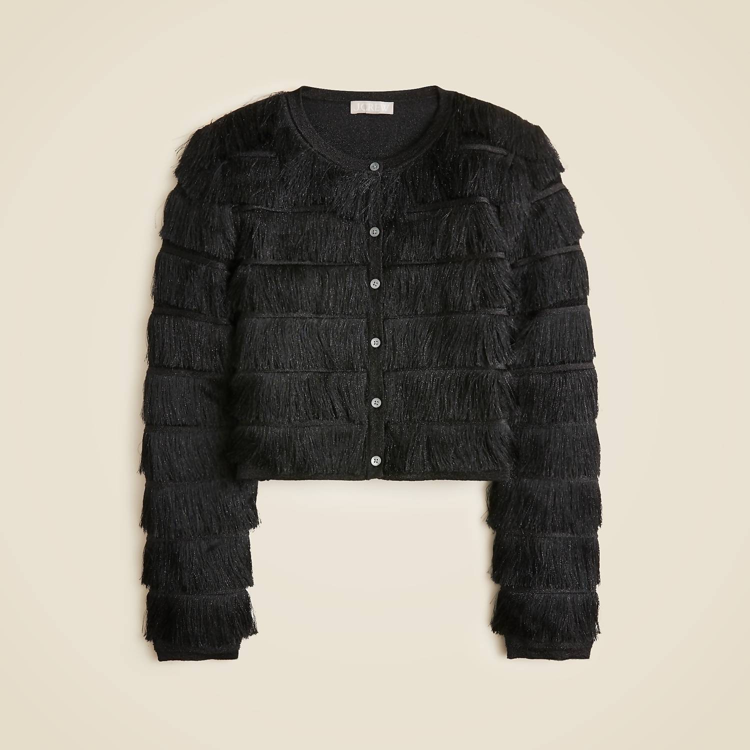 Este cardigan será um favorito para usar em rodízio de suéteres. Arrase com o Cardigan com Franjas em Fio Metálico da J.Crew, com detalhes de franjas vibrantes que adicionam textura e movimento. Este cardigan de manga comprida é confeccionado em uma mistura de 47% viscose, 35% poliéster e 18% fios metálicos, refletindo a luz com perfeição em um acabamento preto metálico. Com corte cropped e comprimento de 45 cm, ele fica um pouco acima do quadril, proporcionando uma silhueta elegante. Originário da China e com fecho de botão, requer lavagem à mão e secagem na horizontal para manter seu charme texturizado.