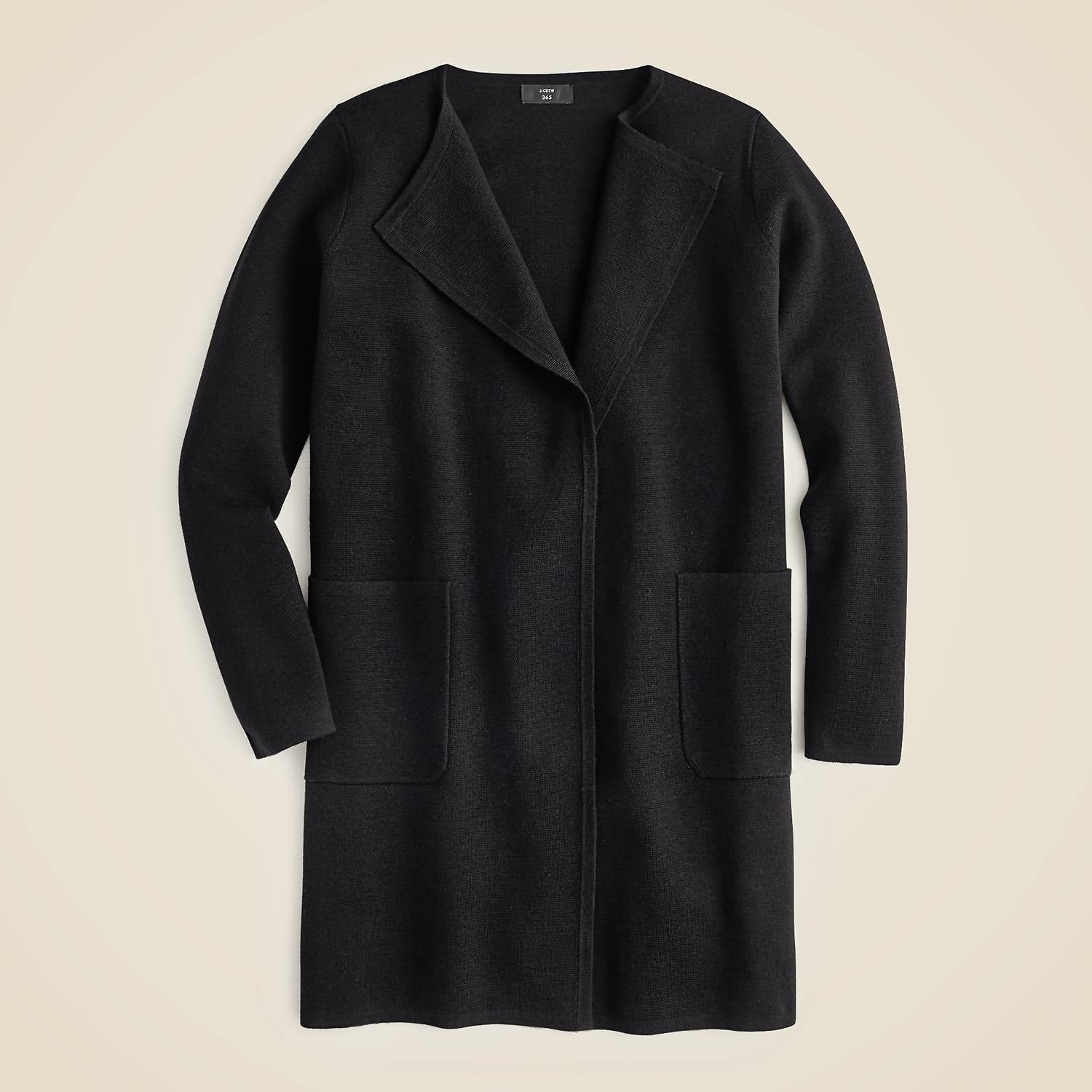 Um ajuste clássico que funciona tão bem abotoado quanto aberto. Apresentamos o blazer-suéter sem gola Juliette da J.Crew, uma peça versátil para o seu guarda-roupa que combina o conforto de um cardigan com o estilo de um blazer. Esta peça preta em mistura de algodão apresenta mangas compridas e é habilmente confeccionada com 35% algodão, 35% poliéster e 30% lã merino. Desenhado na China, atinge o meio da coxa, tem 86 cm de comprimento e 76 cm de comprimento de manga, oferecendo um corte solto com bolsos aplicados e uma frente aberta em cascata. Cuidados: Lavar somente a seco. A modelo tem 1,75 m e veste tamanho P.