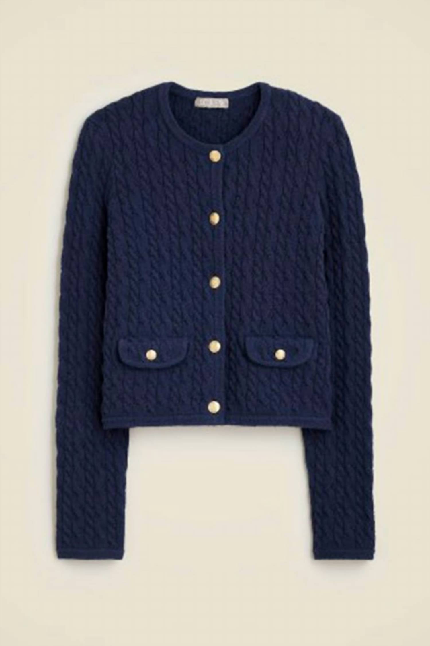 Use este adorável cardigan sobre qualquer camisola ou regata. Apresentamos a Jaqueta Feminina Odette Cable-knit Sweater da J.Crew, uma mistura estilosa de jaqueta e cardigan em azul-marinho atemporal. Esta peça aconchegante de manga comprida é confeccionada em uma mistura de 68% algodão, 31% poliamida e 1% elastano, com um acabamento texturizado luxuoso. A peça é originária da China e possui fecho de botão, com detalhes cuidadosos como botões dourados com brasão e bolsos com aba. Desenhada com corte cropped, mede 49 cm de comprimento e requer lavagem a seco para um cuidado ideal.