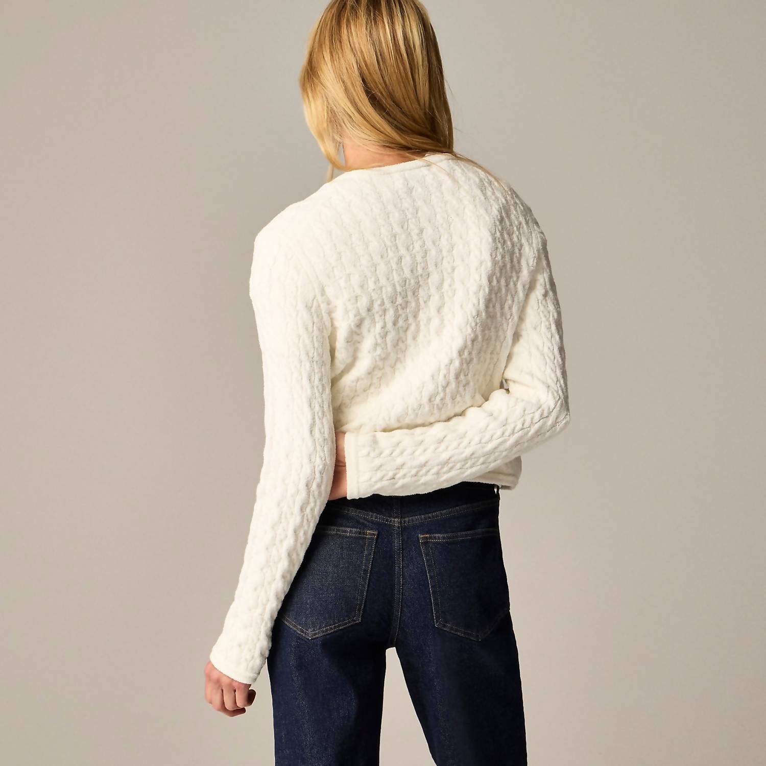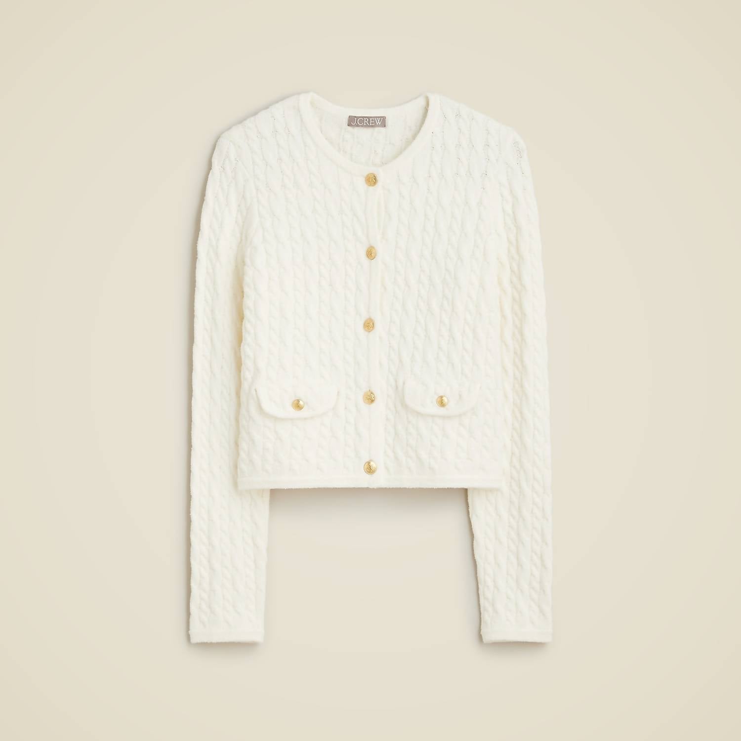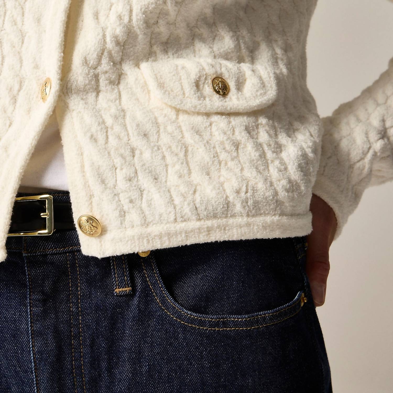 Use este adorável cardigan sobre qualquer camisola ou regata. Apresentamos a Jaqueta Feminina J.Crew Odette em Tricô Cable-knit na elegante cor marfim, que equilibra perfeitamente um casaco com um toque de cardigan. Esta peça feminina possui mangas longas e corte cropped, confeccionada em 68% algodão, 31% poliamida e 1% elastano para uma textura confortável. Com 49 cm de comprimento, é meticulosamente confeccionada na China, com fecho de botão e bolsos funcionais com aba. As instruções de cuidado recomendam lavagem a seco para manter a qualidade do seu design texturizado em tricô cable.