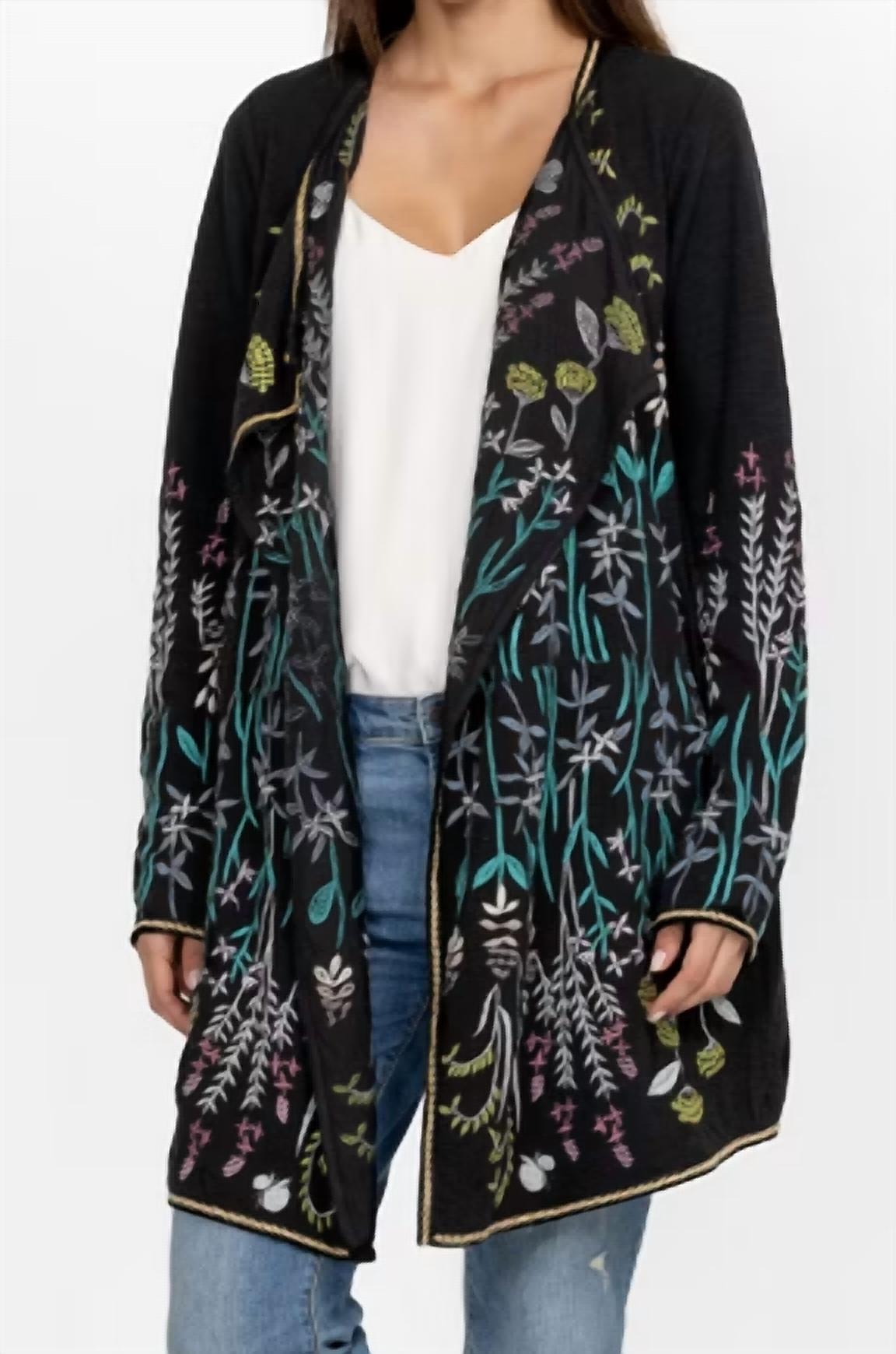 Este cardigan será um favorito para usar em rodízio de suéteres. Eleve seu guarda-roupa de inverno com o suéter Ashlyn da Johnny Was, uma mistura perfeita de estilo boho chic e luxo. Este cardigan feminino em preto clássico apresenta um design com estampa vibrante e mangas longas, finalizado com um versátil decote em V. Confeccionado em algodão confortável, possui fecho pull-on e bolsos práticos. Fácil de cuidar, seguindo as instruções de lavagem à máquina e secagem em tambor. Ideal para eventos noturnos, especialmente as comemorações de Ano Novo.