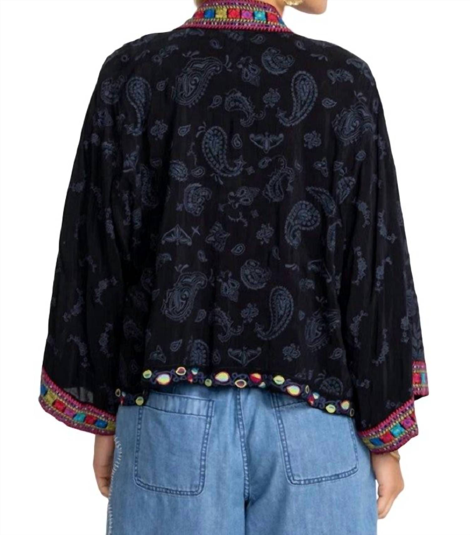 Um corte clássico que funciona tão bem abotoado quanto aberto. Este quimono é confeccionado em um material leve e apresenta bolsos, mangas compridas, um padrão tonal e detalhes coloridos nas bordas para um acabamento artístico. 100% rayon. Medidas para o tamanho M: Busto - 114 cm, Comprimento - 56 cm. Lavar à máquina somente com água fria. Usar alvejante sem cloro quando necessário. Secar em temperatura baixa. Passar a ferro em temperatura morna.