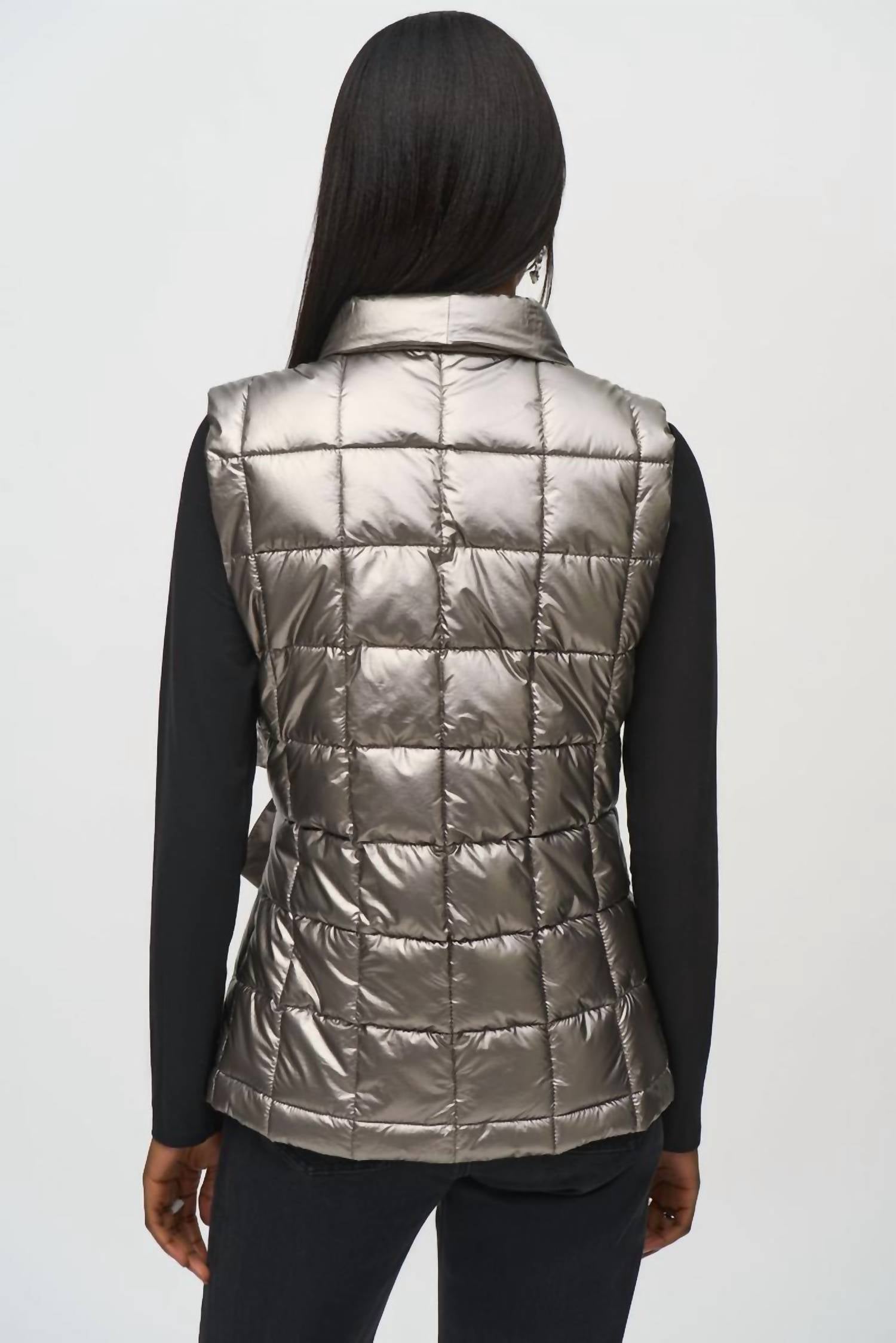 Eleve sua coleção de agasalhos com o Colete Acolchoado Metálico Joseph Ribkoff, um elegante acessório sem mangas em um tom de estanho marcante. Confeccionado em uma mistura de 52% poliuretano e 48% nylon, este colete possui uma sofisticada gola xale e um prático cinto na cintura para um ajuste personalizado. O padrão sólido e os bolsos funcionais o tornam estiloso e prático, perfeito para a mulher moderna. Fechamento: Sem fecho. Ideal para adicionar um toque brilhante a qualquer look, este colete é forrado para maior conforto.