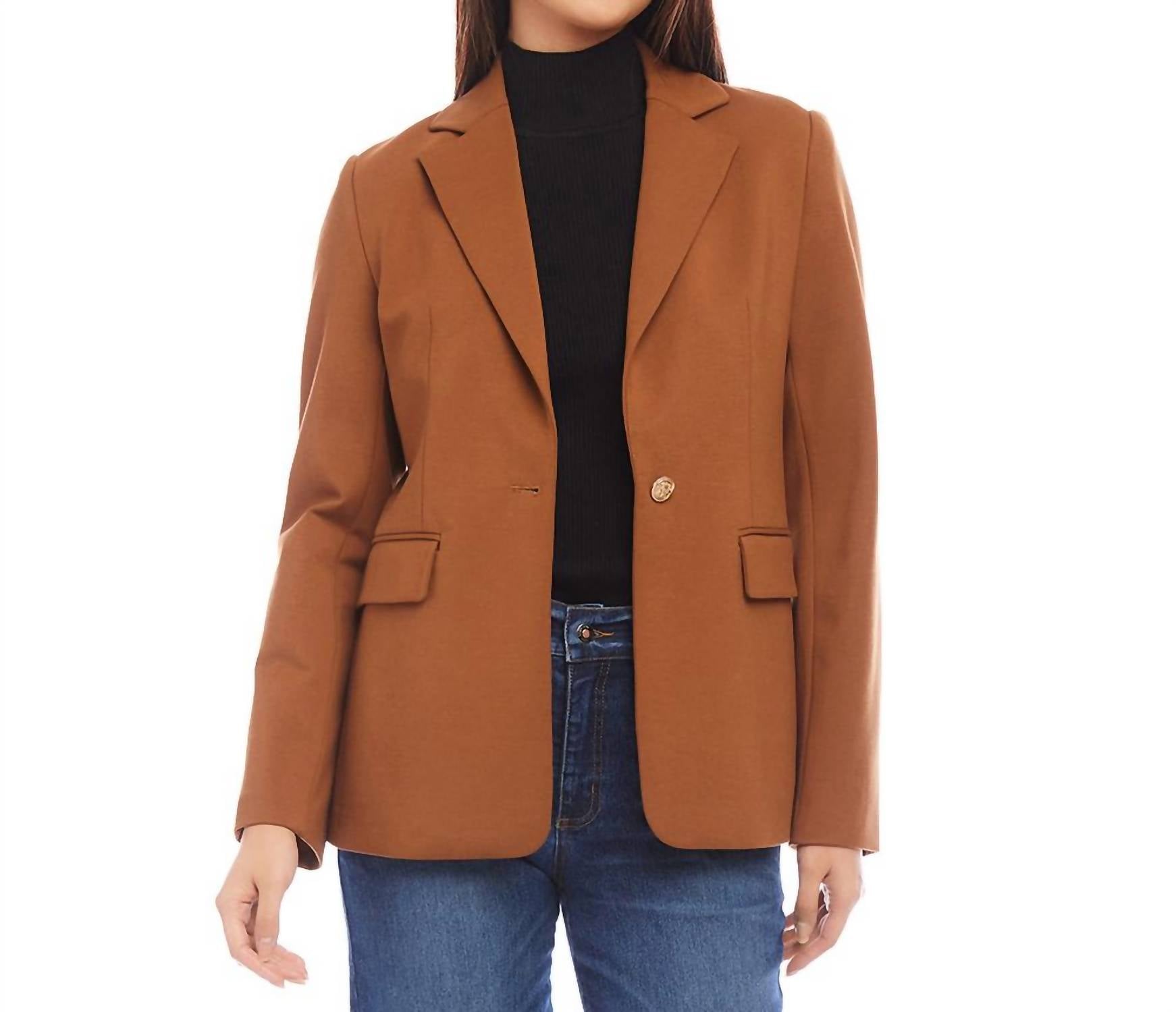 Uma versão elevada do seu blazer clássico favorito. Incremente seu guarda-roupa com o blazer Karen Kane Ponte Knit em um rico tom conhaque, confeccionado para um caimento justo. Confeccionado em material Stretch Ponte, ele apresenta uma mistura de 68% rayon, 27% nylon e 5% elastano, garantindo conforto e estilo. Este blazer importado de 71 cm de comprimento possui mangas longas com punhos e fecho frontal por botões. Para melhor conservação, lave somente a seco.