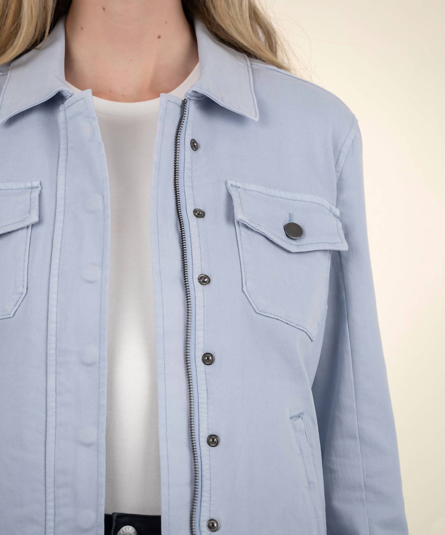 A Jaqueta Amanda Boxy da KUT FROM THE KLOTH é uma adição estilosa a qualquer guarda-roupa de primavera, com seu tom azul-claro e elasticidade confortável. Esta jaqueta feminina de manga comprida apresenta um padrão sólido e um prático fecho de zíper, complementado por bolsos funcionais. Confeccionada em 54% algodão, 22% poliéster, 14% liocel, 9% rayon e 1% elastano, promete durabilidade e conforto. O cuidado é simples, com instruções de lavagem à máquina e secagem em temperatura baixa. A modelo Jaime tem 1,73 m e veste tamanho grande. Altura a partir do ombro: 59 cm.