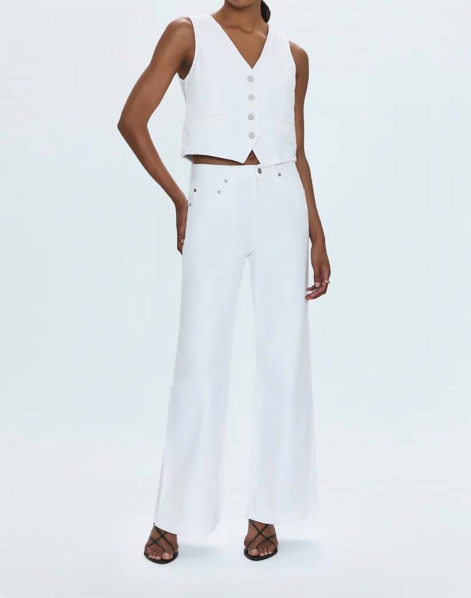 Use este colete sobre uma roupa toda preta para um visual perfeitamente elegante. O colete jeans Vero da PISTOLA é uma peça essencial para o guarda-roupa de qualquer pessoa antenada na moda. Com um corte elegante e elegante, este colete branco sem mangas mede 54 cm de comprimento e é confeccionado em 100% algodão. Possui decote em V e fecho de botão, perfeito para looks versáteis. Importado, este modelo com estampa lisa é fácil de cuidar e segue as instruções de lavagem à máquina.