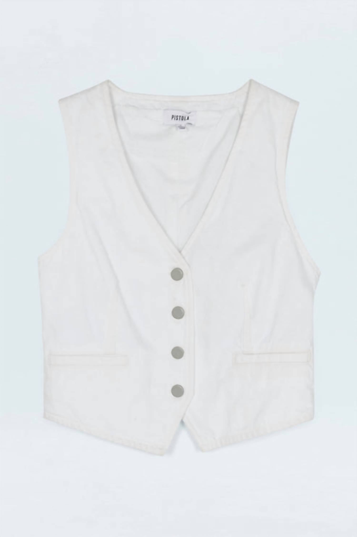 O colete jeans Vero da PISTOLA é uma peça essencial para o guarda-roupa de qualquer pessoa antenada na moda. Com um corte elegante e elegante, este colete branco sem mangas mede 54 cm de comprimento e é confeccionado em 100% algodão. Possui decote em V e fecho de botão, perfeito para looks versáteis. Importado, este modelo com estampa lisa é fácil de cuidar e segue as instruções de lavagem à máquina.