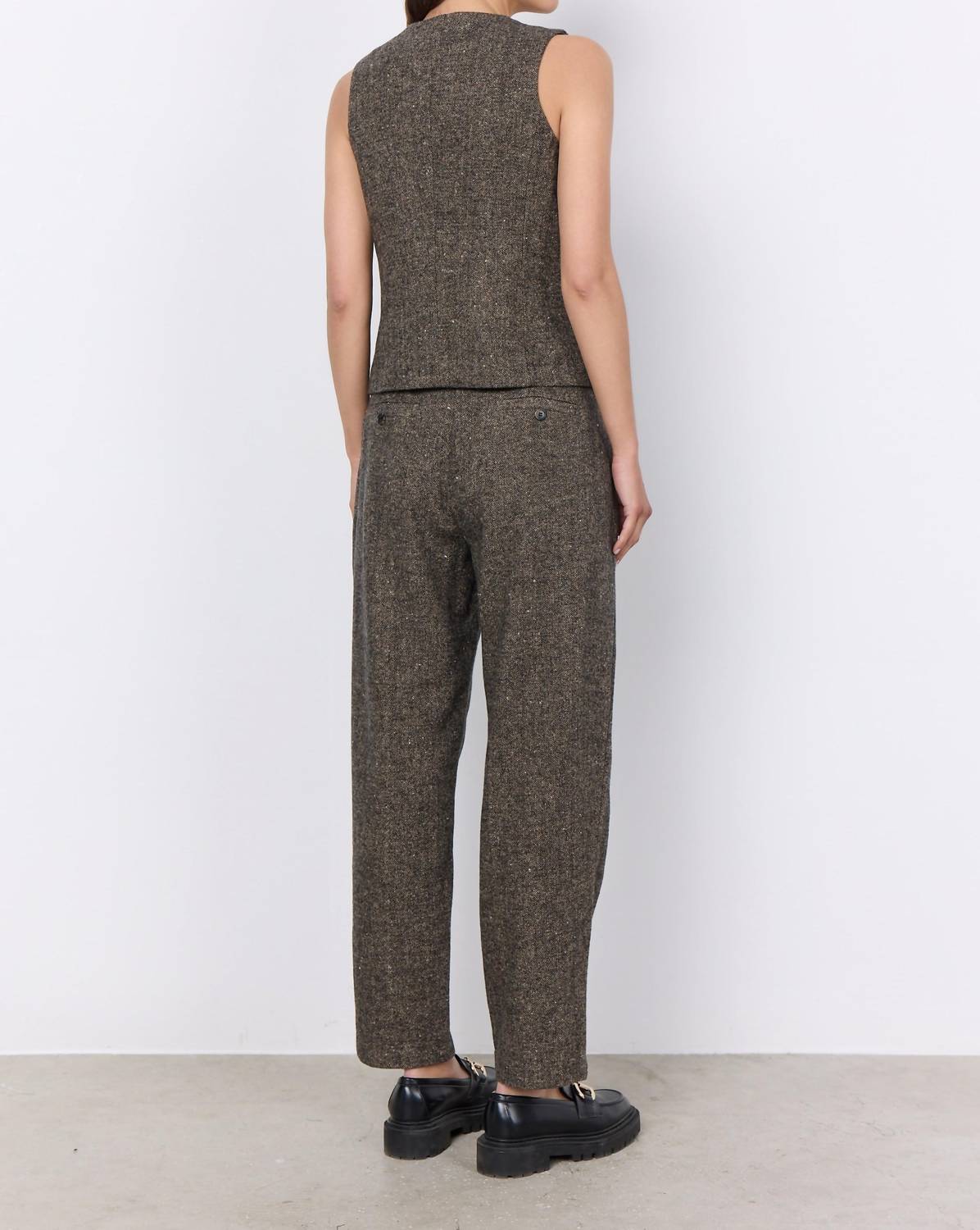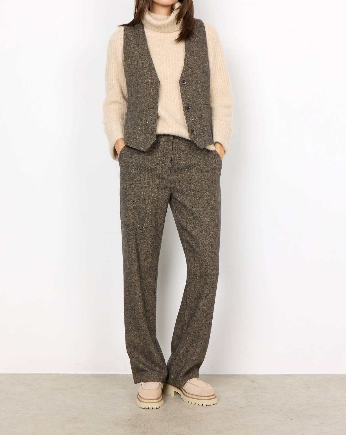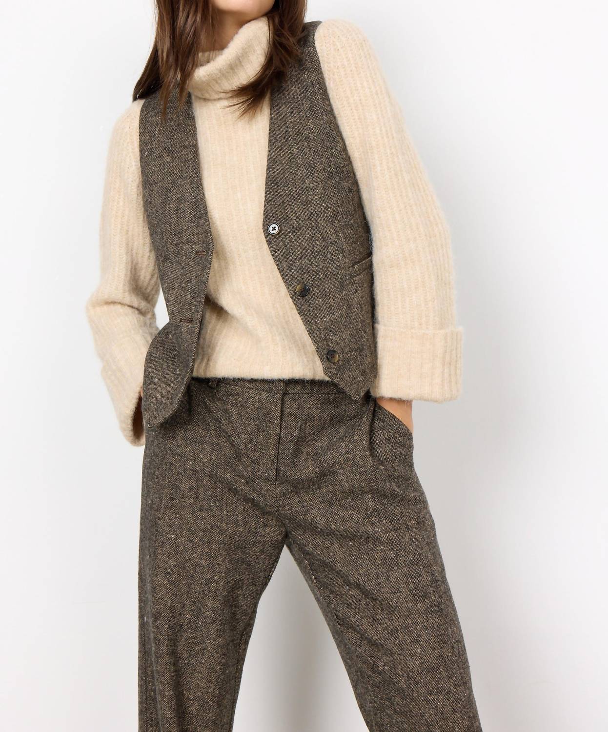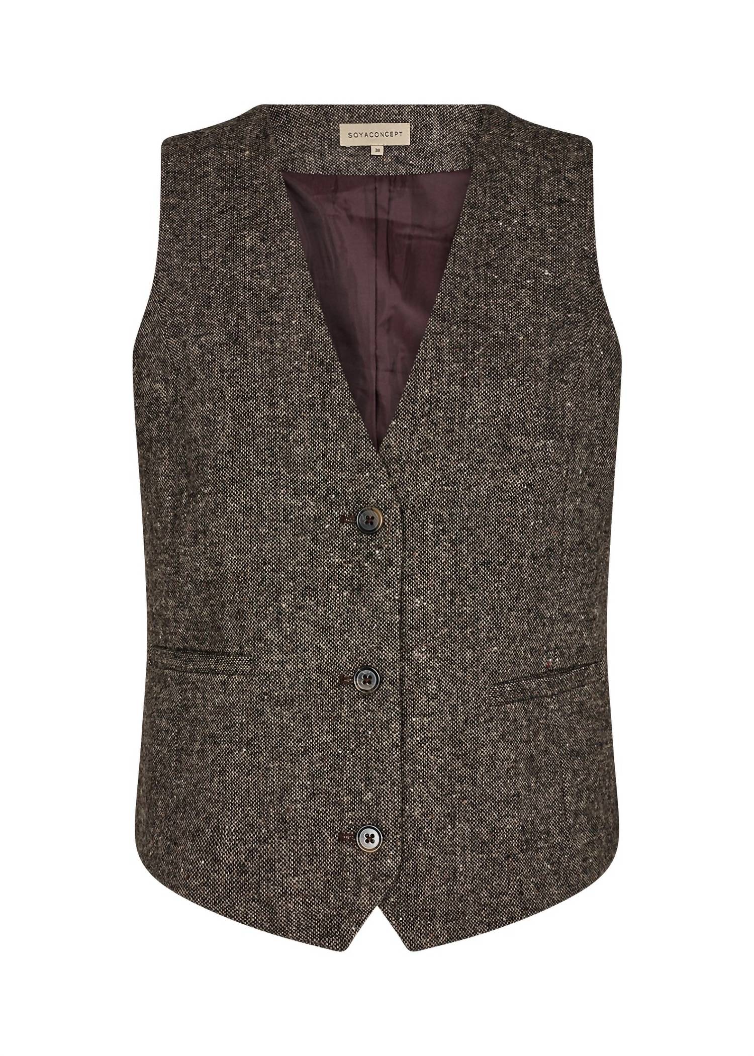 Este colete sem mangas é habilmente confeccionado em uma mistura tátil de 50% lã, 40% poliéster e 10% acrílico, oferecendo um padrão texturizado perfeito para sobreposições. Com um decote em V clássico e fecho prático por botões, ele também possui dois bolsos práticos. Cuide desta peça elegante lavando-a à mão com água fria e secando no varal para manter seu charme atemporal.