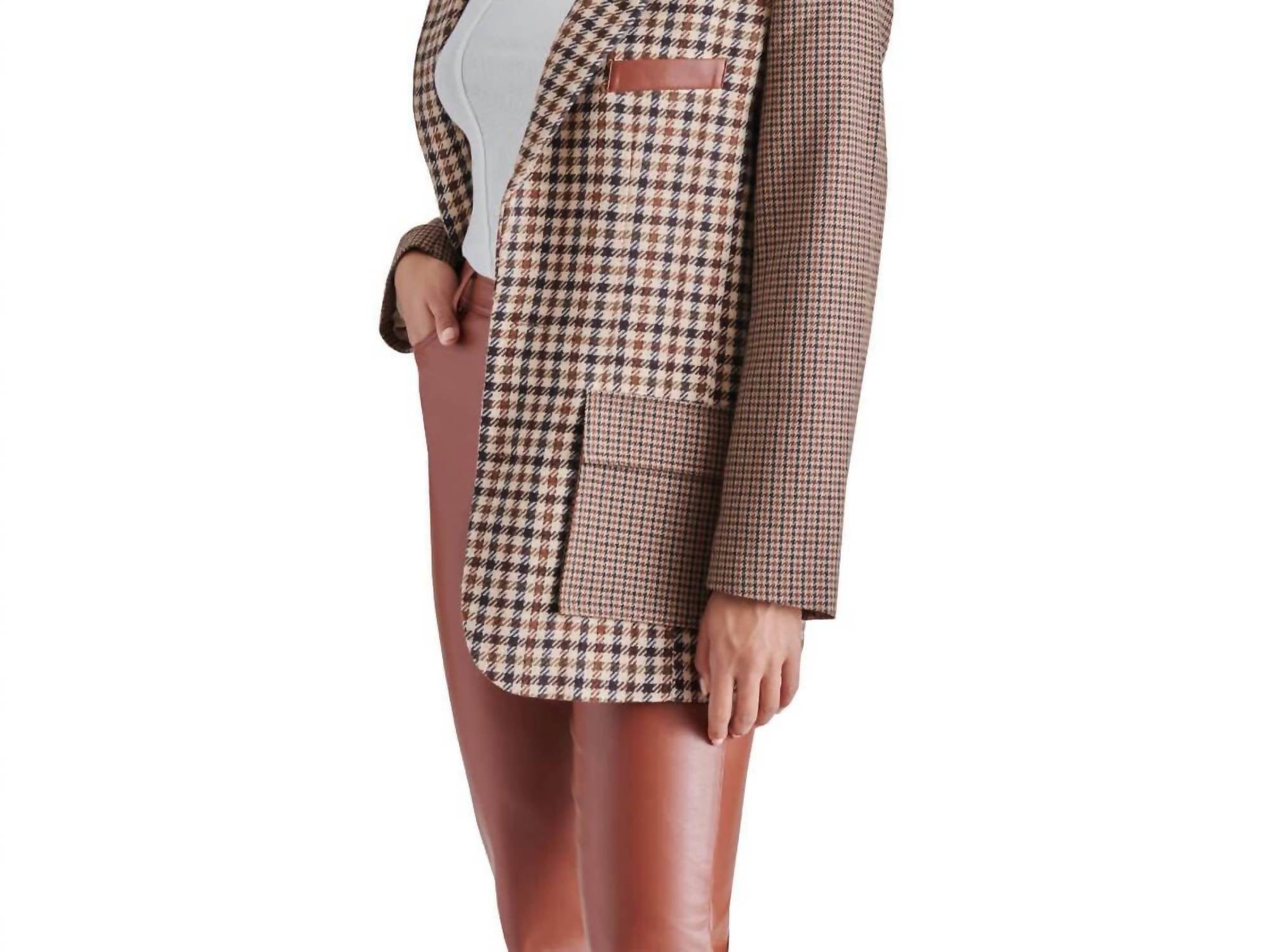 Feito sob medida para a perfeição, este blazer será seu casaco favorito por muitos anos. Blazer boyfriend com mangas contrastantes. Fechamento frontal com dois botões. Dois bolsos frontais contrastantes. Detalhes de lapela em couro vegano. Bolso no peito não funcional em couro vegano. Comprimento: 76 cm. 100% poliéster.