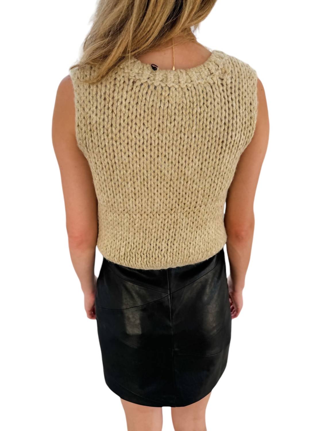 Aquela peça extra que você não sabia que precisava! Apresentamos o Colete Eleny da Steve Madden, uma peça dourada chique e cintilante, perfeita para adicionar glamour ao seu visual. Este colete sem mangas é confeccionado com 63% de fibras metálicas Lurex® e 37% de acrílico, com acabamento canelado aconchegante e decote redondo estiloso. Com 43 cm de comprimento, oferece um acabamento texturizado moderno que complementa qualquer conjunto. Tipo de fecho: Pull-On. Instruções de cuidado: Lavar à máquina, secar na secadora. Fácil de cuidar.
