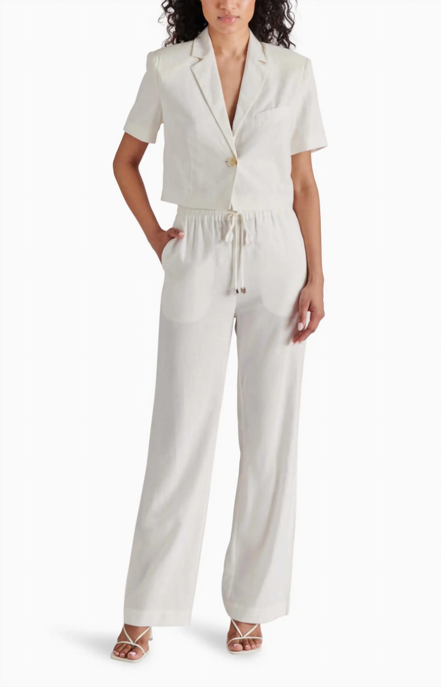 Um blazer tão versátil que você pode usá-lo no escritório ou combiná-lo com jeans para um visual mais casual. Apresentamos o Blazer Fayette da Steve Madden, uma adição chique e sofisticada ao seu guarda-roupa em um tom de nuvem sólido. Este blazer feminino possui mangas curtas e é confeccionado em uma luxuosa mistura de linho, oferecendo estilo e conforto. Projetado com bolsos práticos e fecho de botão para um visual elegante e despojado. Instruções de cuidado: Lavar à mão para maior durabilidade.