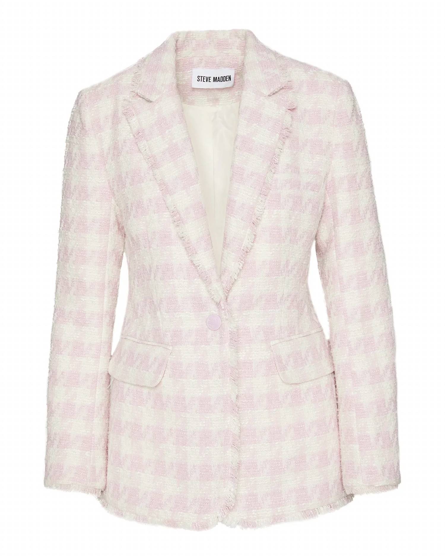Feito sob medida para a perfeição, este blazer será sua jaqueta favorita por muitos anos. Apresentamos o casaco Harlow da STEVE MADDEN, uma adição elegante a qualquer guarda-roupa moderno. Este blazer de manga comprida combina uma estampa pied-de-poule rosa-claro e creme com ombros acolchoados, ideal para adicionar um toque feminino ao seu traje profissional. Confeccionado em uma mistura de 72% poliéster, 20% acrílico, 4% náilon, 2% lã e 2% viscose, com forro 100% poliéster, este tecido de tweed de gramatura média garante conforto e estilo. Fabricado na China, possui fecho frontal por botões e design de três bolsos, perfeito para transitar facilmente de ambientes casuais para formais. Instruções de cuidado: Lavar à mão e secar na horizontal.
