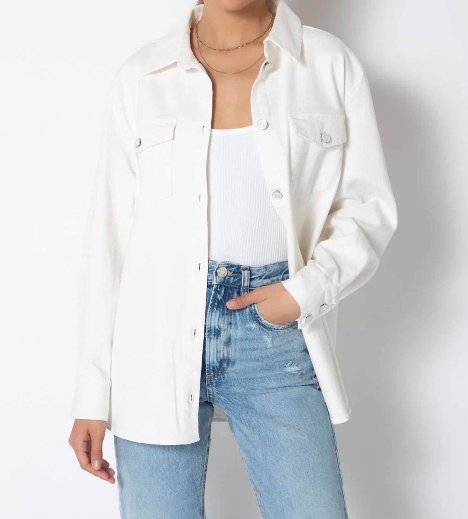 Eleve seu guarda-roupa com a Jaqueta Scout de Manga Longa da Tart Collections, uma peça versátil em branco impecável. Confeccionada em sarja de algodão, esta jaqueta levemente oversized oferece a combinação perfeita de conforto e estilo com seus bolsos funcionais no peito e fecho de botão. Composição: 98% algodão, 2% elastano. Cuidados: Lavar à máquina com água fria em ciclo delicado, secar na horizontal e passar a ferro em temperatura baixa, se necessário. A modelo tem 1,70 m e veste tamanho extragrande.