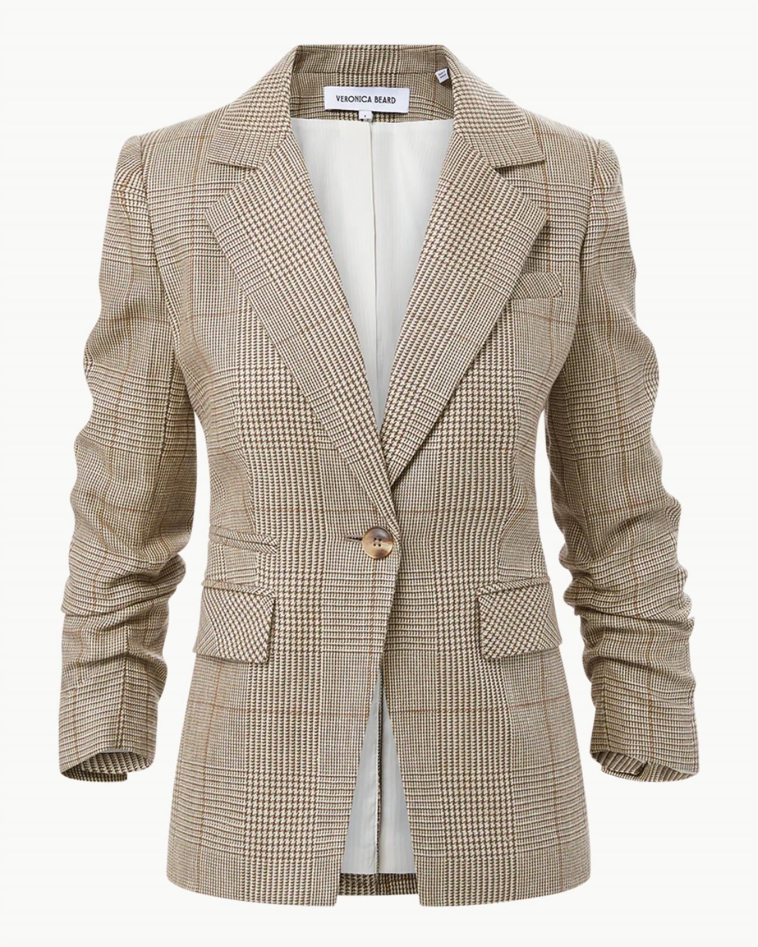 Esta jaqueta em mistura de linho italiano apresenta mangas longas franzidas e um caimento elegante e alongado para um visual elegante. Confeccionada em 72% linho, 28% algodão, com forro de 96% poliéster e 4% elastano. Comprimento da peça: 69 cm e comprimento da manga: 73 cm para o tamanho 2. Fecho de botão em tecido tartaruga. Adote o estilo versátil do xadrez Glen, perfeito para elevar o seu guarda-roupa.