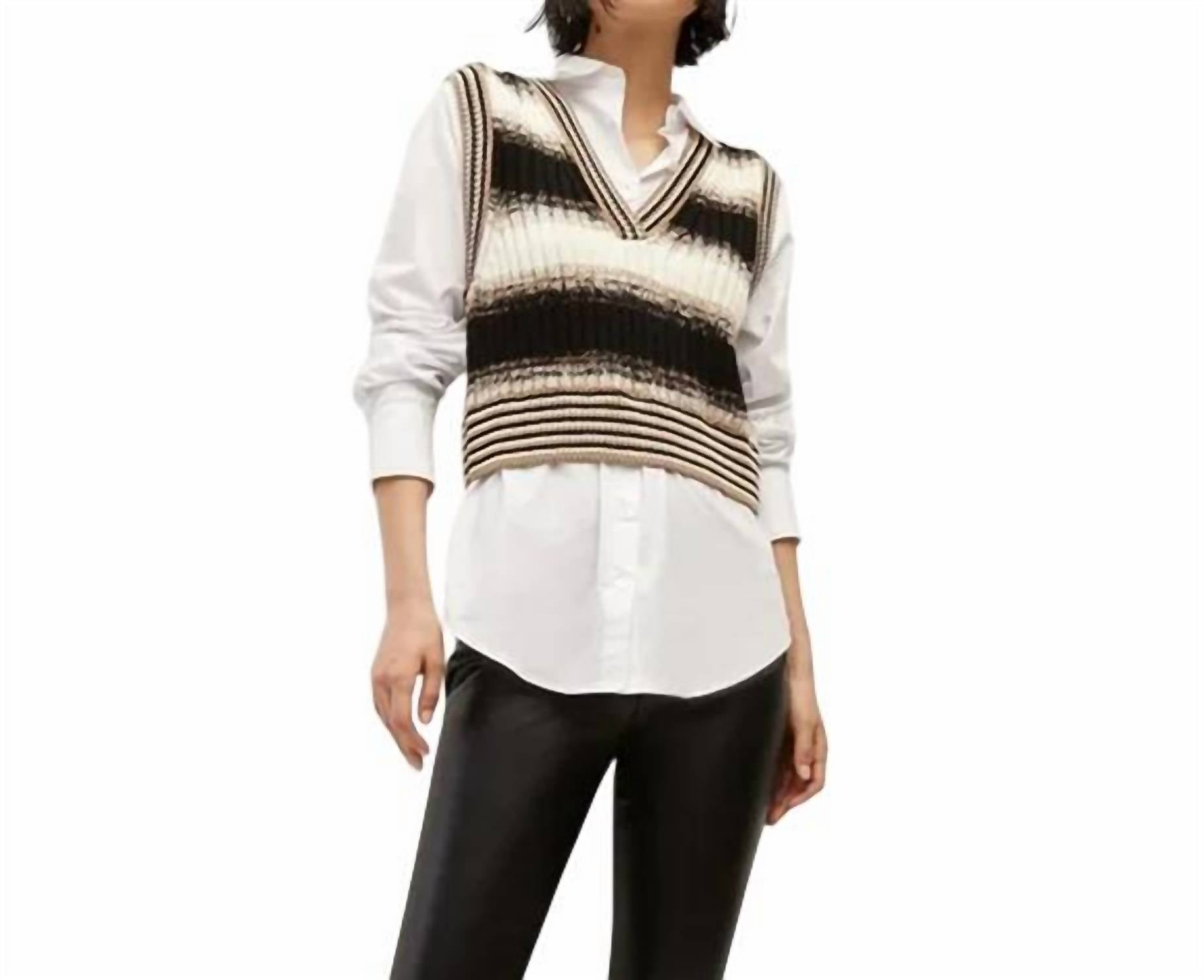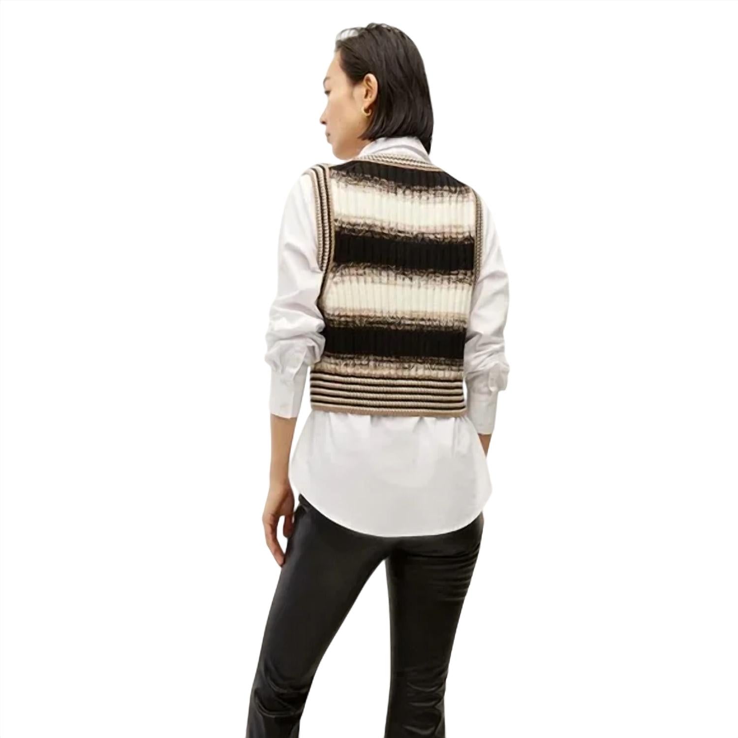 Aquela peça extra que você não sabia que precisava! Uma adição chique a qualquer guarda-roupa moderno. Este colete sem mangas em preto multicolorido apresenta um elegante padrão de listras e decote em V. Confeccionado com uma sobreposição 100% lã merino e uma camada interna de mistura de algodão, poliamida e elastano para um toque premium. Vista. Lave à mão e seque no varal.