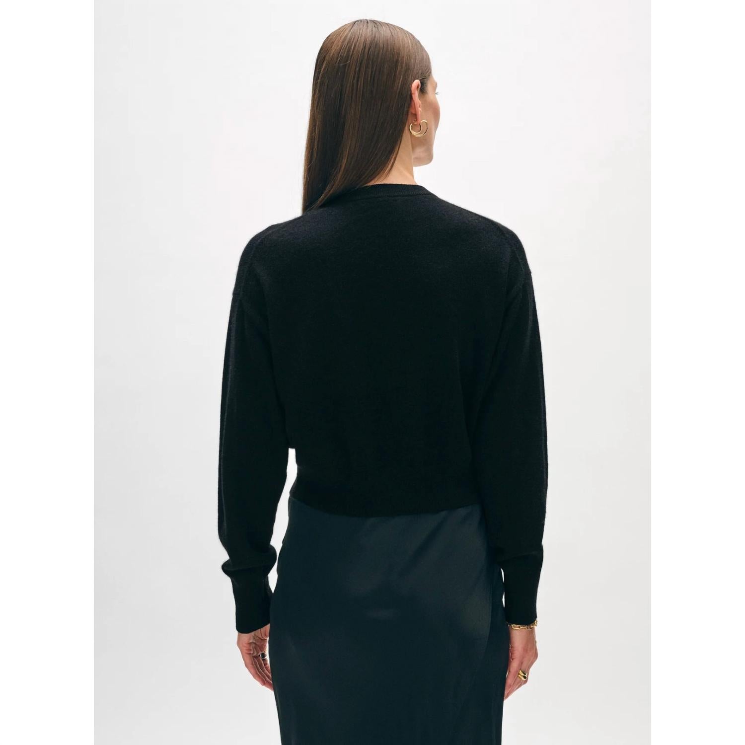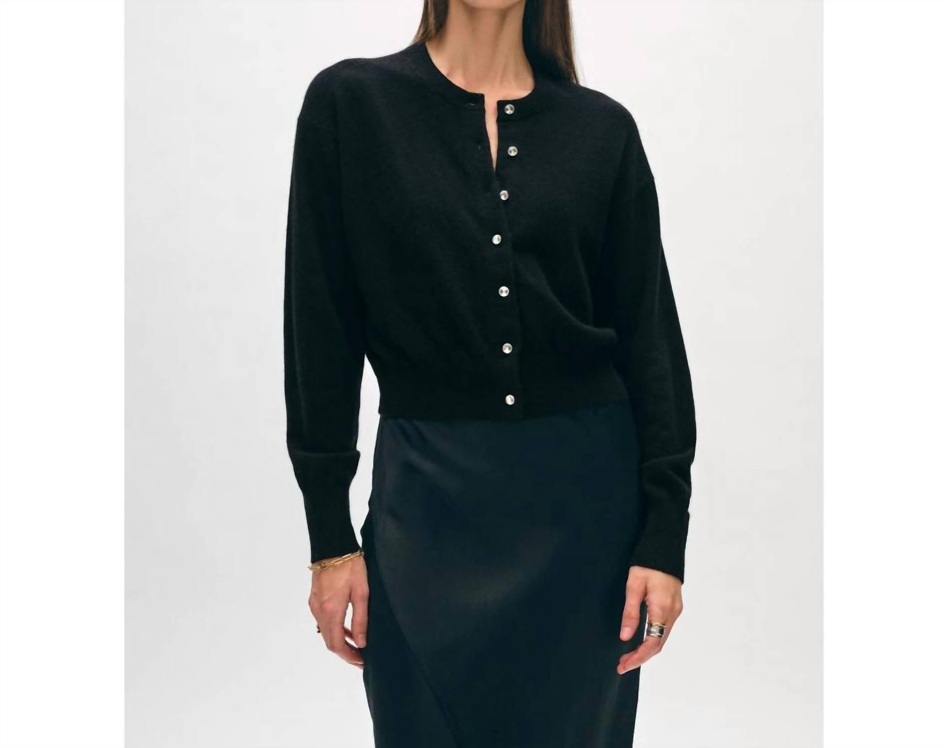 Este cardigan será um favorito para usar em rodízio de suéteres. Cor | Preto 100% Caxemira Somente limpeza a seco Ajuste reto Manga comprida A modelo tem 1,75 m e veste tamanho pequeno O comprimento no tamanho pequeno é 19"